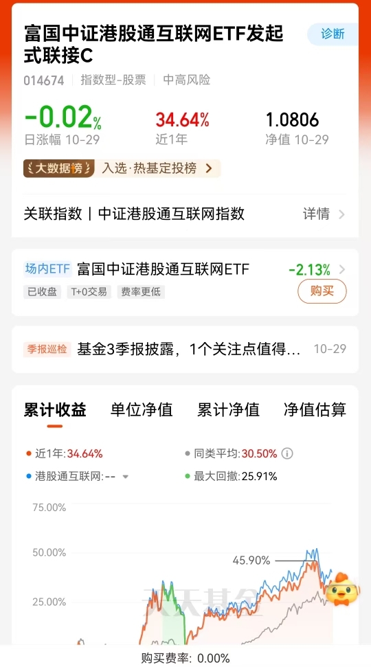港股互联网最近真争气!我拿的富国中证港股通互联网ETF联接C,两年涨了59%,跑