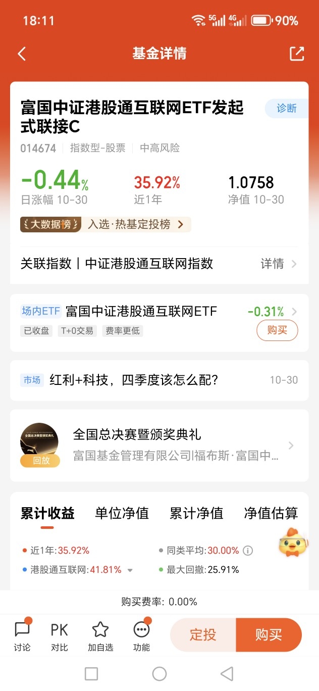 最近港股互联网回暖明显,我拿的富国中证港股通互联网ETF联接C不到俩月涨了快15