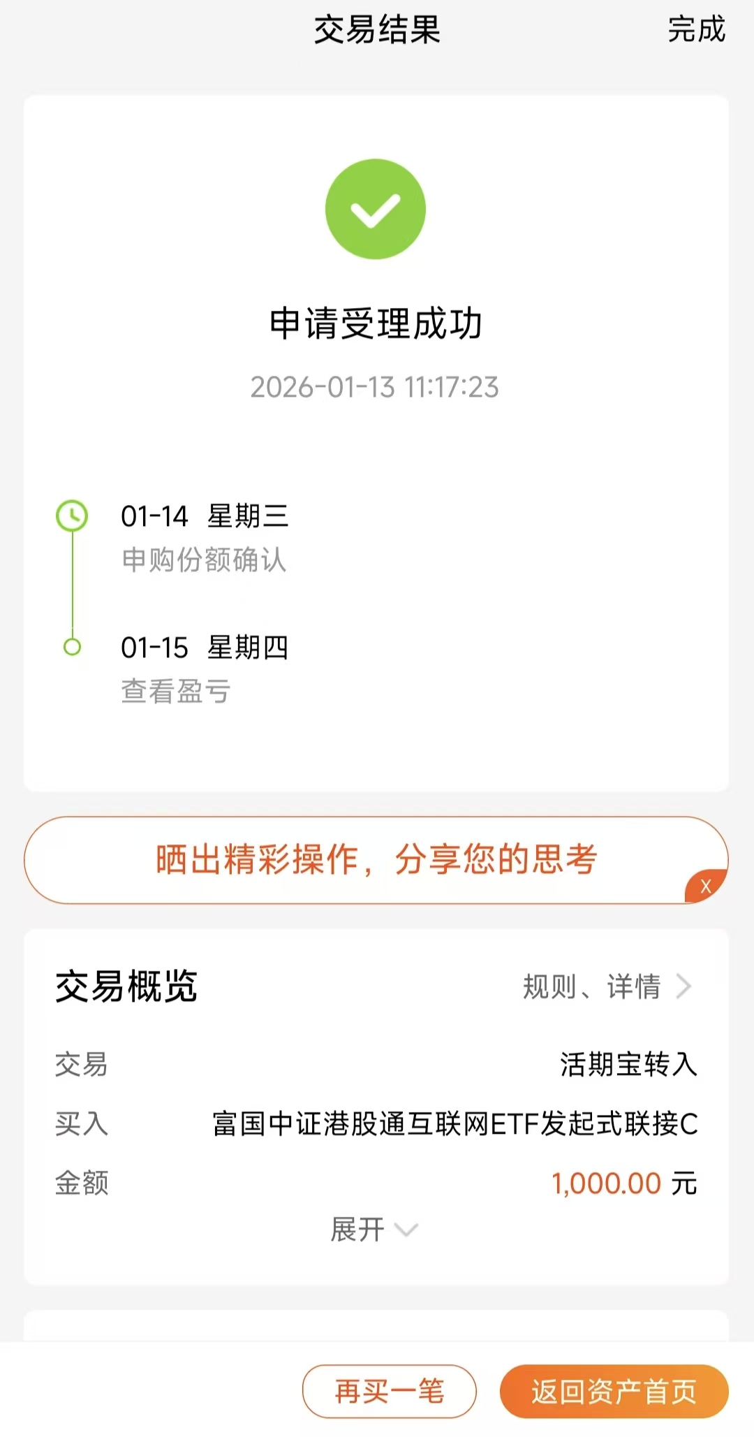 具体投资上,我选择了$富国中证港股通互联网ETF发起式联接C(OTCFUND|014674)$,用于把握AI应用方向的机会,依然是采用分批操作的模式,今天先加仓了第一笔。
