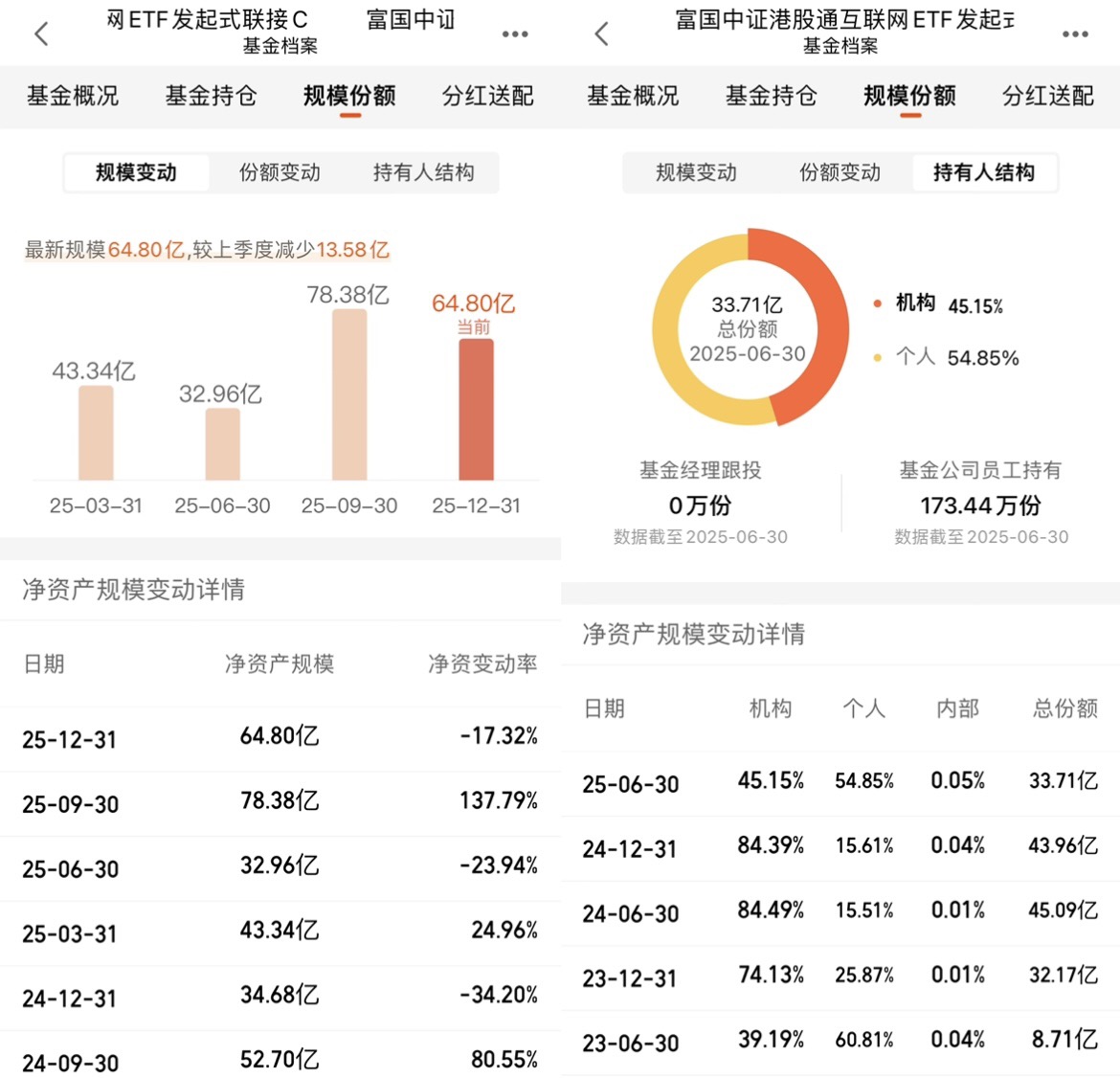 截至2025年12月31日,这只基金的规模为64.80亿港元。对于指数基金来说,规模太小容易受到申赎冲击,规模太大则会影响调仓效率。64.80亿的规模刚好处于“黄金区间”,既能保证流动性,又能灵活应对市场变化。从2025年的规模变动来看,虽然在四季度有所回落,但整体保持了稳定。这说明基金的投资者结构比较健康,没有出现大规模的集中赎回。另外,基金的机构投资者占比为45.15%,个人投资者占比为54.85%,这种“机构+个人”的组合,也有助于降低基金的流动性风险。