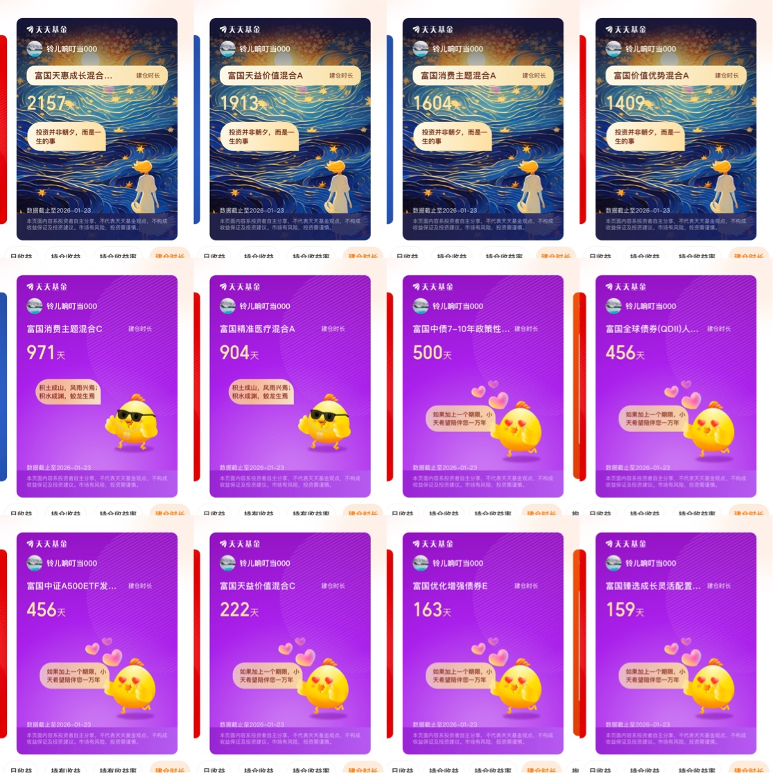 在文章的最后,我还要再说一点,我认识富国基金已经很多年了,从最初在朋友推荐下抱着试试的心态买了第一只富国天惠成长混合,到现在手机里的天天基金持仓页几乎被它家的产品填满,我对富国的感情早就从单纯的信任变成了发自内心的认可和热爱。我始终觉得,这家基金公司有点不一样,他用实际行动告诉我“投资并非朝夕,而是一生的事”,这句话后来成了我在市场波动里稳住心态的锚点。这几年里,我跟着富国经历了很多,比如2023年的市场震荡,也享受到了2025年AI行情带来的红利,不管是消费主题、医疗赛道还是港股互联网,它家的产品总能精准踩中我看好的方向,更难得的是,在我持仓浮亏或者犹豫要不要赎回的时候,富国基金总能给我一点继续坚持下去的勇气和信心!我特别喜欢它家的C类份额设计,0申购费和满7天免赎回费的规则,让我这种喜欢小额定投、灵活调整的普通投资者,不用再为费率精打细算,能更安心地把精力放在长期持有上。蔡卡尔、田希蒙这些基金经理的名字,我已经能像熟悉朋友一样脱口而出,他们管理的指数基金跟踪误差小,量化投资能力扎实,让我不用再纠结个股选择,就能稳稳拿到行业平均收益甚至超额回报。作为国内“老十家”基金公司,富国1.3万亿的管理规模和800多只基金的布局,让我觉得它就像一个靠谱的大管家,不管我是想布局A股核心资产,还是配置港股科技赛道,或者买点债券基金做防守,都能在它家找到合适的产品。最让我感动的是,它从不刻意宣传短期高收益,而是一直用“长期主义”的理念引导投资者,就像那些陪伴我度过的几百个日夜,一直都在提醒我,投资就像种一棵树,要耐心等待它生根发芽,而不是急着想要结果。现在我已经把富国基金当成了资产配置的核心选择,不仅自己投资,还把它推荐给了身边的家人朋友,看着他们也从市场小白变成了能看懂持仓、坚持长期投资的理性投资者,我知道这份对富国的热爱和认可,早已经成了我和他们之间的默契。未来的路还很长,我相信只要跟着富国的节奏,守住长期主义的初心,就能在起伏的市场里,稳稳赚到属于自己的那一份收益。