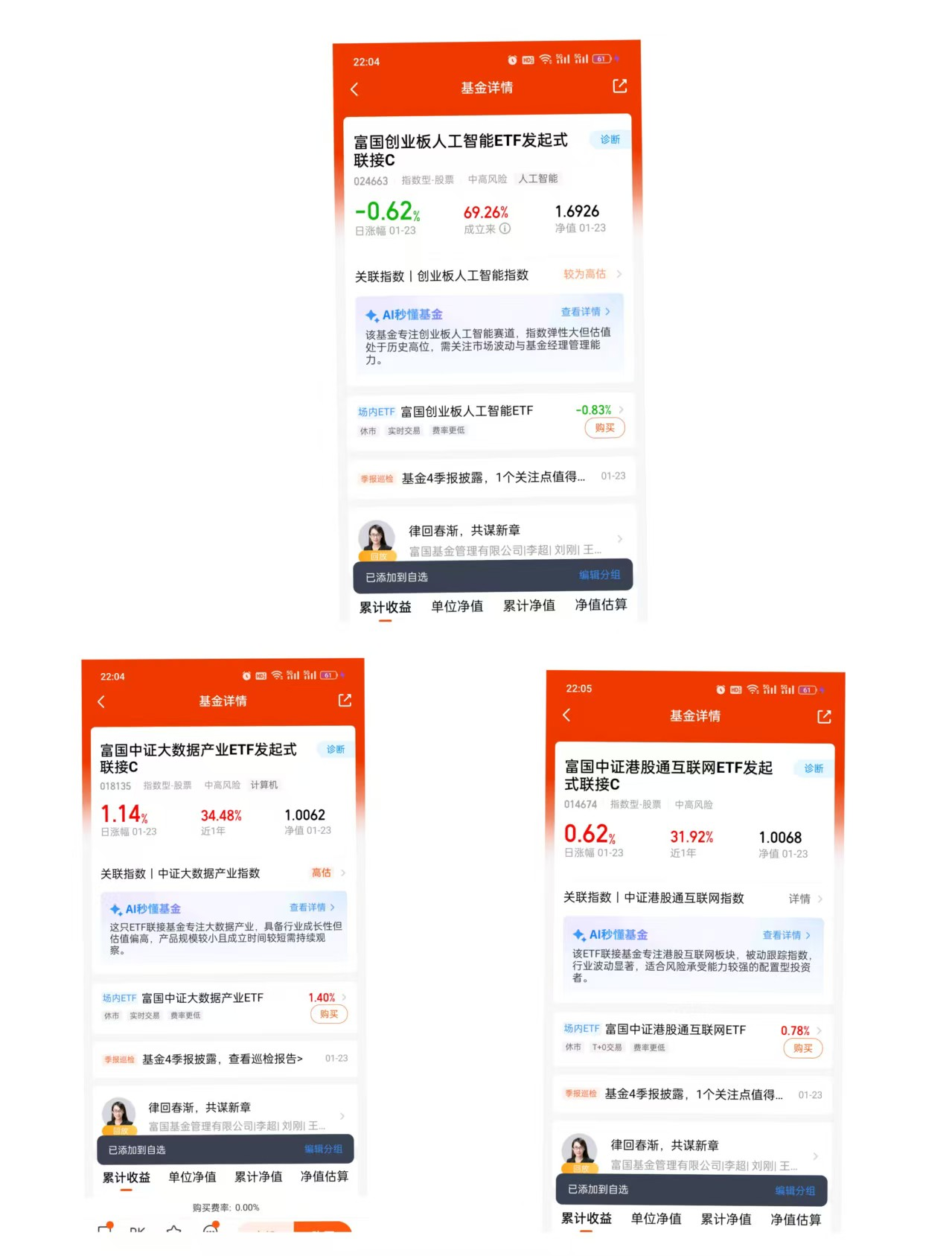 对于普通投资者来说,想要抓住港股AI的机会,但又担心个股波动太大,指数基金是个不错的选择。像$富国中证港股通互联网ETF发起式联接C$ 这样的产品,跟踪的是中证港股通互联网指数,重仓股包括阿里(18.58%)、小米(15.79%)、腾讯(14.97%)、美团(11.45%)等互联网龙头。这些公司的业务与AI产业链深度绑定——阿里有通义千问,腾讯有混元大模型,美团在即时配送算法上积累深厚,小米则在AIoT领域布局广泛。通过一只基金就能打包这些巨头,既分散了风险,又不会错过板块的整体行情。