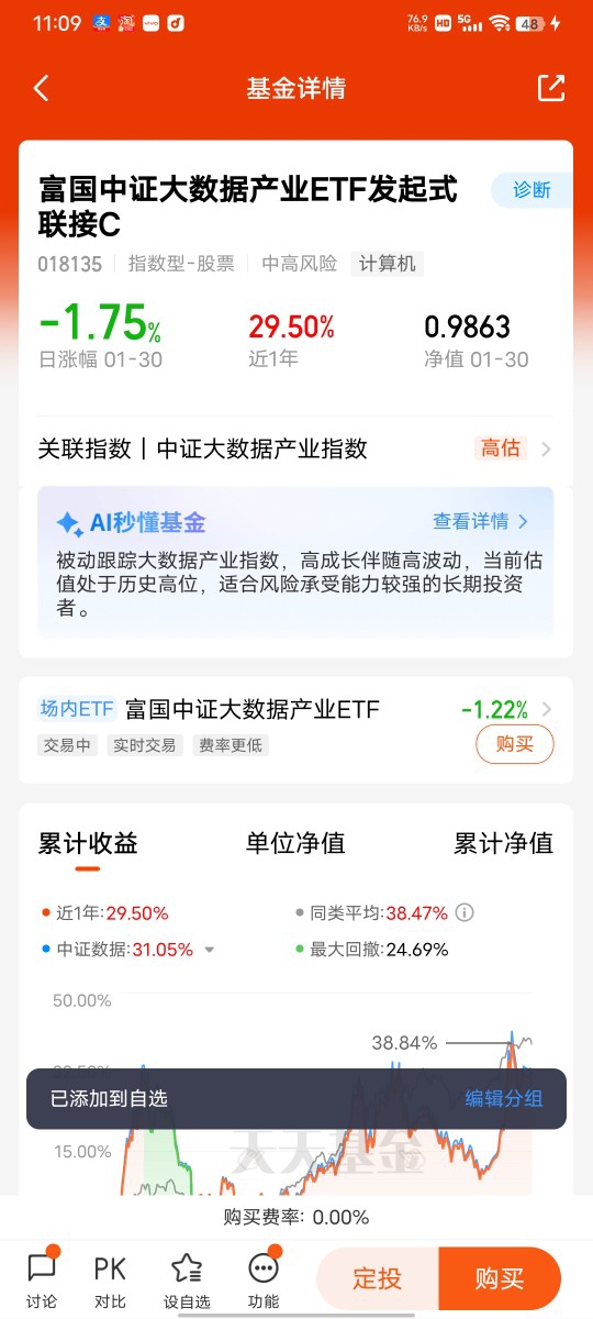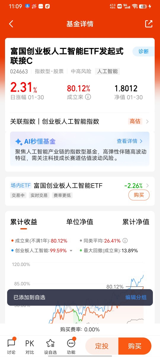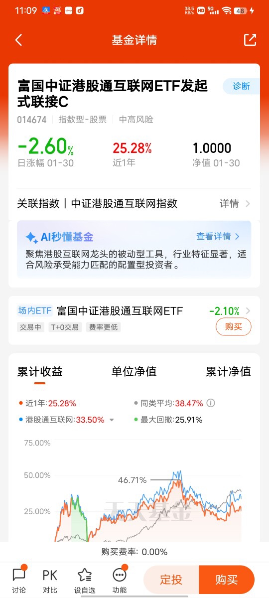 资金面的支撑也让我更有底气,南向资金2025年净流入超1.27万亿港元,2026年1月单月净流入更是达到689.71亿港元,其中269.29亿港元精准流入科技板块,腾讯、小米分别获得101.08亿、113.17亿港元的净买入,成为南向资金的核心加仓标的。在众多基金中,我持续重仓富国中证港股通互联网ETF发起式联接C(014674) ,这只基金完全契合我的投资逻辑:95.04%的仓位紧密跟踪富国中证港股通互联网ETF,间接覆盖了腾讯、阿里、美团等AI应用龙头,这些标的既有庞大的用户基数和场景优势,又在AI技术研发上持续投入,2025年腾讯AI相关收入占比即将突破30%,阿里云因算力需求实现34%的高速增长,这些业绩增长都将直接反映在基金净值中。从业绩表现来看,这只基金2025年全年收益率达25.98%,近1月涨幅也达5.72%,完美捕捉了板块估值修复红利,而且最大回撤仅14.02%,在同类基金中风险控制表现优异。对于我这种追求产业趋势与收益平衡的激进型投资者来说,它就是布局港股AI行情的最优工具,2026年只要AI应用持续爆发,南向资金保持流入态势,这只基金大概率能复刻甚至超越2025年的上涨行情,我