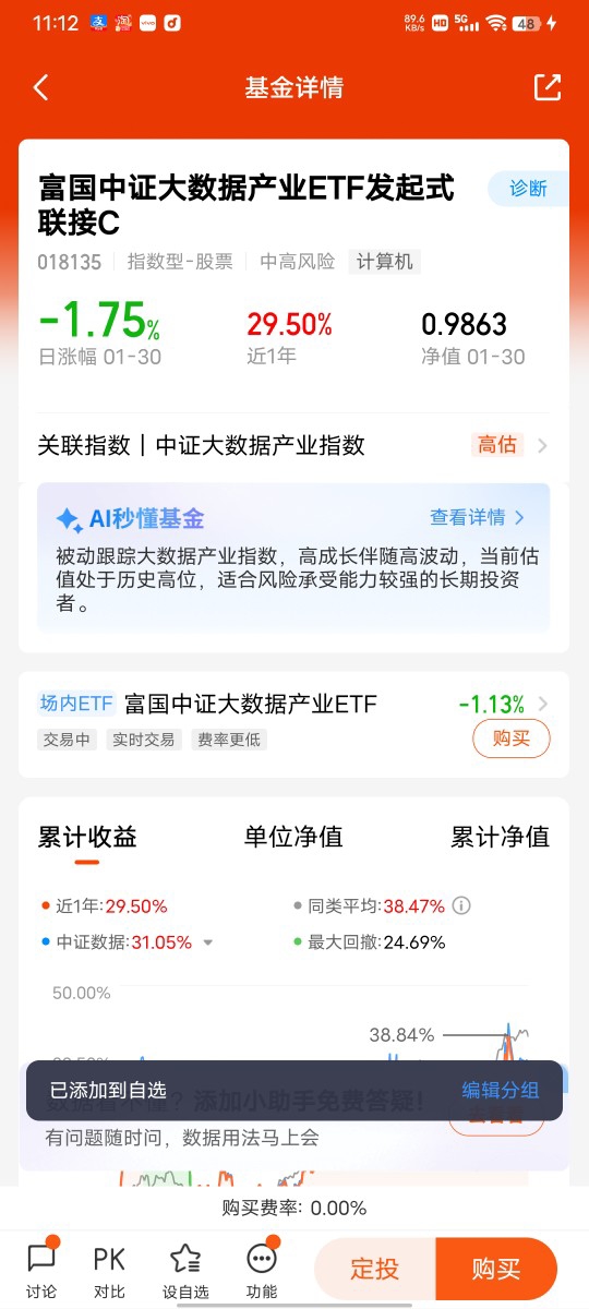 而AI产业的发展进度完全超出了我的预期,2025年还停留在技术演示阶段的大模型,2026年已全面融入各行各业。腾讯混元大模型在金融、医疗领域的应用落地,为企业客户降低了20%的运营成本;美团AI调度系统将骑手准时率提升至96%,同时降低了12%的配送成本;商汤科技的计算机视觉技术在智能驾驶、智慧城市领域的渗透率持续提升,这些都不是短期炒作的概念,而是能持续提升企业盈利能力的核心竞争力。经过多番对比,我最终选择富国中证港股通互联网ETF发起式联接C作为核心配置标的,这只基金的持仓结构完美契合我的稳健投资需求:其跟踪的中证港股通互联网指数前十大权重股合计占比近77%,涵盖了腾讯、阿里、小米、快手等行业龙头,这些企业不仅在AI应用上布局深远,而且具备稳定的现金流和强大的抗风险能力,能够在市场波动中保持业绩韧性。