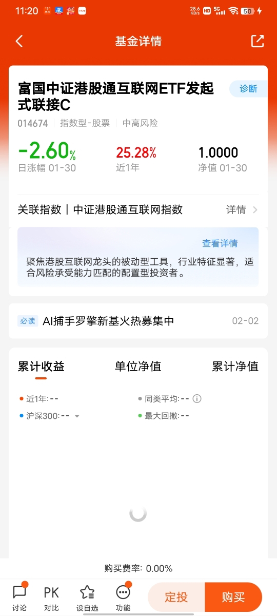 在基金选择上,我始终坚持“数据说话”的原则,经过对近50只港股科技相关基金的业绩、持仓、风险等多维度数据对比,富国中证港股通互联网ETF发起式联接C(014674) 脱颖而出。从业绩数据来看,这只基金近1月涨幅5.72%、近3月涨幅12.45%、近1年涨幅25.98%、近2年涨幅83.87%,无论短期还是长期,业绩表现都稳居同类基金前20%,远超同类平均水平。从持仓数据来看,基金95.04%的仓位跟踪富国中证港股通互联网ETF,持仓标的透明可查,前十大权重股合计占比近77%,涵盖了腾讯、阿里、美团、小米等AI全产业链龙头,这些标的的AI业务增速均高于行业平均水平,能够精准捕捉产业红利。