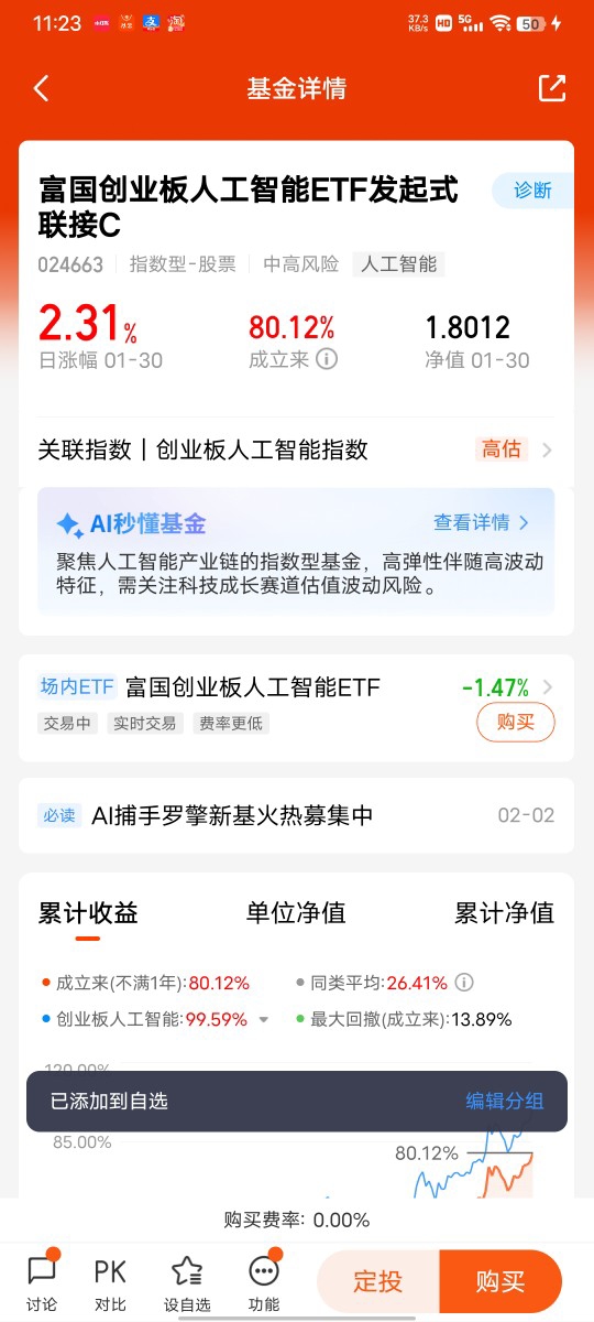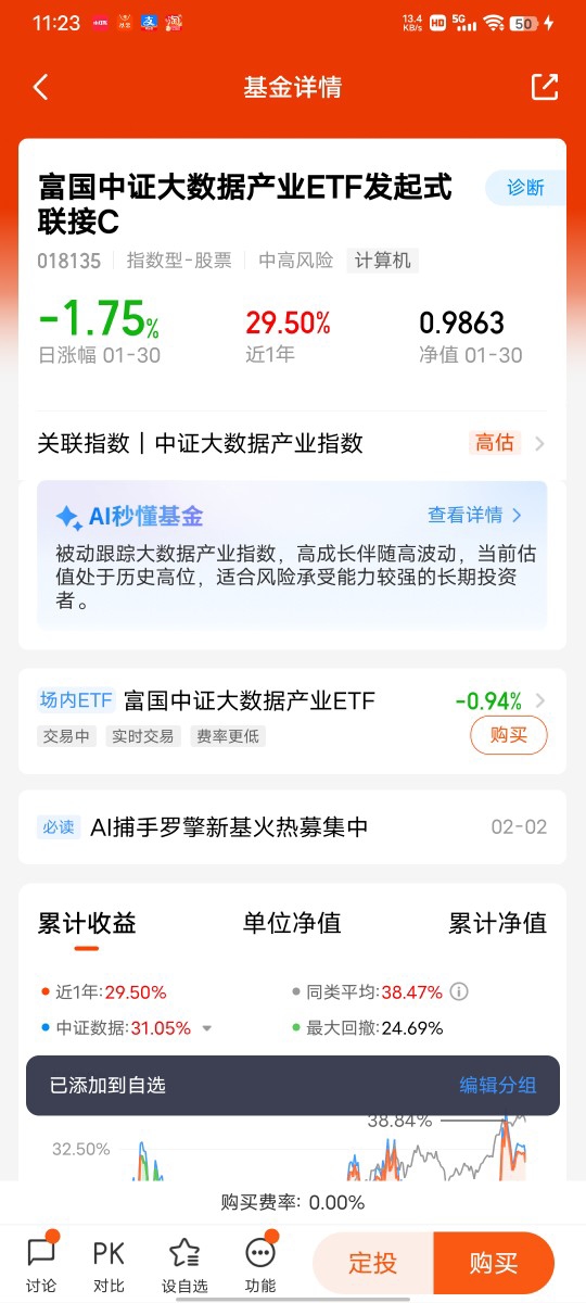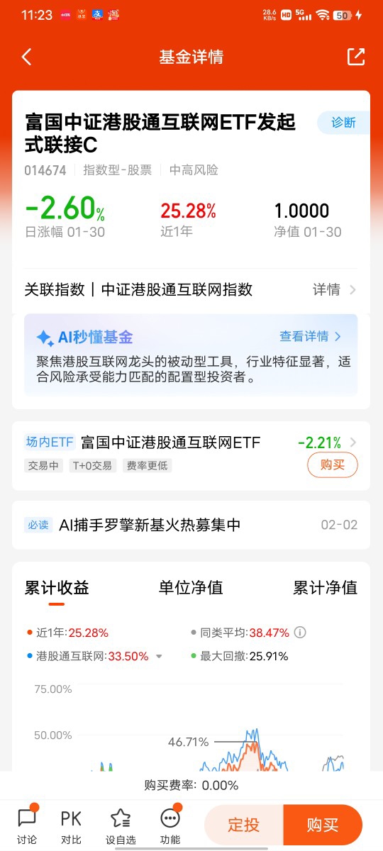 在选择基金时,我优先考虑规模大、业绩稳、管理人实力强的产品,经过反复对比,富国中证港股通互联网ETF发起式联接C(014674) 成为了我的最终选择。首先,这只基金的管理人是富国基金,作为国内头部基金公司,管理资产超1.37万亿元,投研团队经验丰富,能够为基金的稳健运作提供有力保障,对于我这种新手来说,大公司的产品更让人放心。其次,基金的业绩表现非常亮眼,2025年全年涨了25.98%,1月也涨了5.72%,而且近2年涨了83.87%,远超同类基金,这样的业绩让我对它的未来表现充满期待。