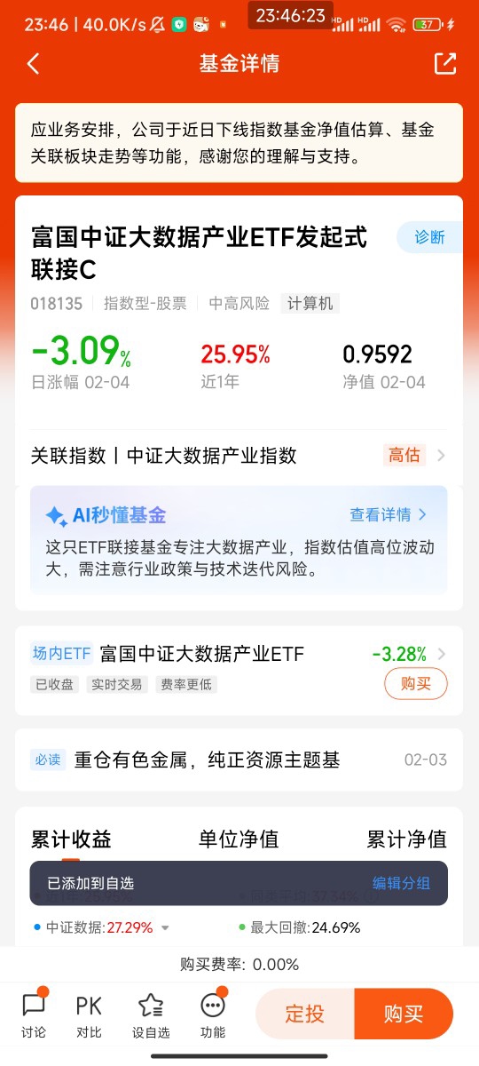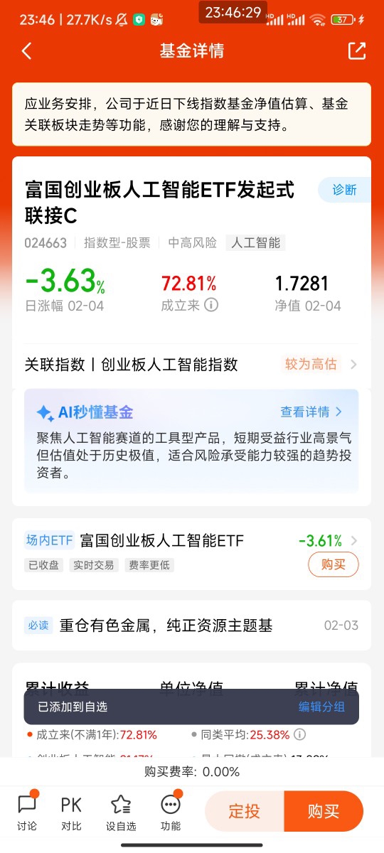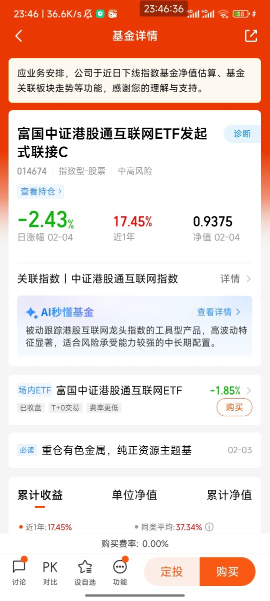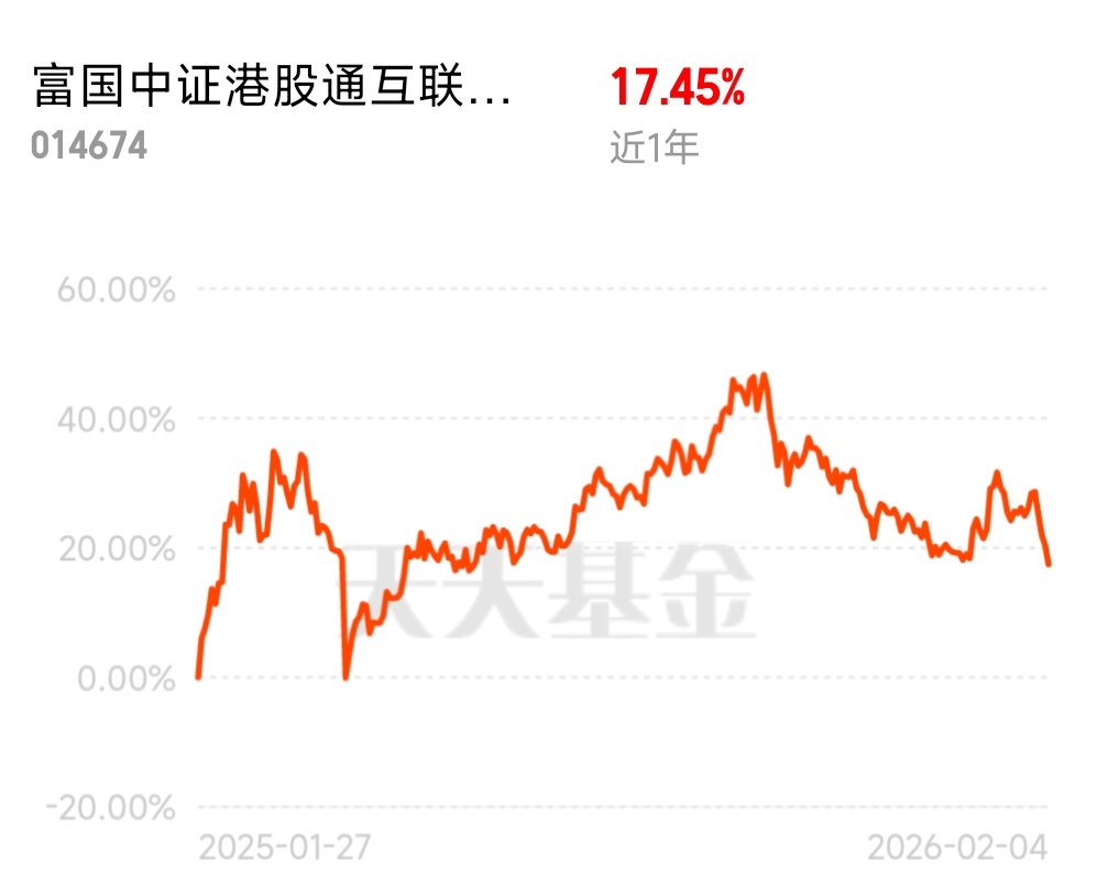 不过有一说一,当前港股科技板块也有不少波动。就拿我持有的富国中证港股通互联网C来说,近3个月跌了10.02%,2月4日当天也跌了2.43%,看着确实有点让人揪心。但大家要知道,科技股尤其是AI相关的股票,波动本来就比其他板块大,短期的回调是很正常的。而且从长期来看,这只基金近12个月还是涨了20.37%,说明只要拿得住,收益还是不错的。对普通投资者来说,直接买单只港股科技股风险太高,容易踩雷,而通过富国中证港股通互联网C这样的ETF联接基金来布局,就相当于一次性买了一篮子港股互联网科技股,能有效分散风险,不用费心去挑选个股,特别省心。