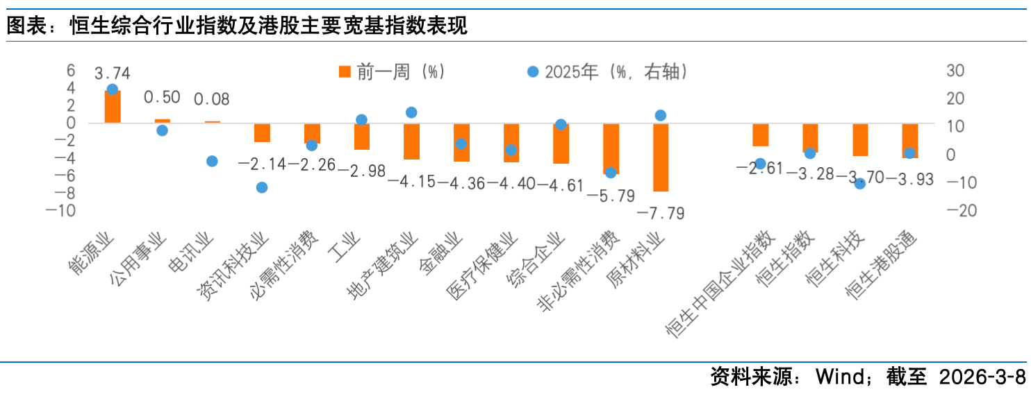 过去一周,港股市场整体呈现震荡下行态势,主要指数全线收跌,板块表现分化显著。其中,恒生指数下跌3.28%,恒生中国企业指数下跌2.61%,恒生科技指数下跌3.70%,市场整体风险偏好处于低位。板块方面,防御性及受益于地缘冲突的板块表现突出,能源业以3.74%的涨幅领涨市场,公用事业、电讯业分别上涨0.50%、0.08%,表现相对抗跌;而原材料业(-7.79%)、非必需性消费(-5.79%)和综合企业(-4.61%)则跌幅居前。资金流向方面,南向资金全周合计净卖出80.94亿港元,尤其是3月5日单日净卖出277.35亿港元,创下历史新高,显示出在内外部不确定性加剧时,部分内地资金选择阶段性离场观望。从影响因素来看,市场走弱的核心海外驱动因素在于地缘政治风险的突然升级以及美国经济数据分化带来的政策不确定性。受美国和以色列对伊朗发动军事打击以及随后中东冲突扩大的影响,全球资本市场避险情绪升温。霍尔木兹海峡作为全球能源运输要道的安全受到威胁,导致石油和天然气价格飙升,并引发市场对能源供应中断进而推高通胀并抑制全球经济增长的担忧。“类滞胀”交易逻辑直接冲击全球权益市场估值中枢,港股作为离岸市场,受海外流动性预期波动影响较大。国内方面,两会召开释放稳增长信号,但2月官方制造业PMI继续处于收缩区间,显示经济内生动能修复的脆弱性,内外夹击之下市场情绪难以提振。