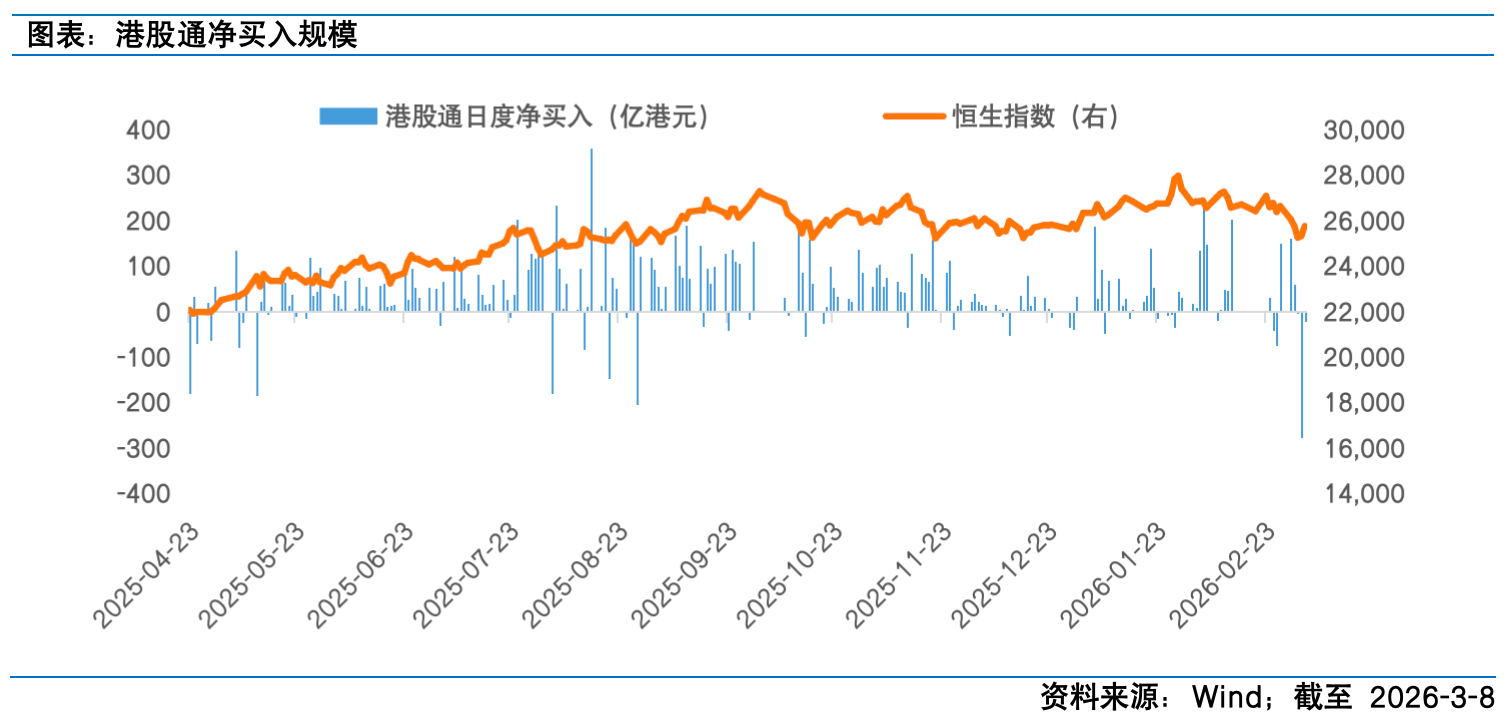 海外市场方面,美国经济数据的矛盾加剧了市场对美联储政策路径的博弈。ISM数据显示,美国2月制造业PMI录得52.4,虽较上月略有下降但高于预期,连续第二个月处于扩张区间;其中就业数据环比显著改善,但物价分项指数创2022年6月以来新高,反映出美国制造业复苏韧性较强,但通胀压力仍存。服务业方面,2月服务业PMI超出预期,较上月上升2.3点至56.1,创2022年11月以来新高,新订单、商业活动和就业分项增长强劲,同时物价指数较1月有所放缓,显示服务业通胀压力边际缓解。就业数据方面,不同机构发布的数据呈现分化,ADP报告显示,2月私营部门就业人数增加6.3万人,高于市场预期及前值,为去年11月以来最高月度增幅,主要受益于建筑业、教育业和医疗服务业的就业增长;截至2月28日当周的首次申请失业救济人数为21.3万人,略低于预期且与前值持平,同时咨询公司Challenger,Gray&Christmas报告显示2月美国企业裁员人数大幅下降至4.8万人,较1月份的10.8万人显著减少,印证美国劳动力市场趋于稳定。然而,周五美国劳工统计局公布的非农就业数据意外疲软,2月非农就业人数减少9.2万人,远低于市场预期,失业率小幅上升至4.4%,市场情绪出现明显转变,数据公布后市场对年内降息的预期次数有所增加。对于港股而言,美国经济的复苏韧性对支撑风险资产表现,但非农的疲软使得美联储在抑制通胀与稳定就业之间的平衡难度加大,政策不确定性上升。在5月美联储主席换届之前,政策立场大概率将保持观望,海外股市及港股的流动性难以得到实质性改善。叠加中东冲突升级带来的全球风险偏好恶化,导致海外资金对新兴市场资产的配置意愿下降。