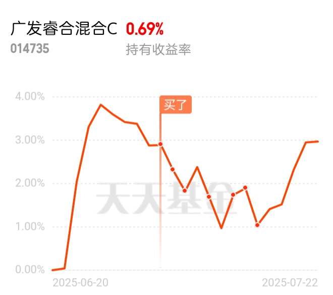 今天应该连涨六天了吧,这个基金近三年业绩不行,现在航空占比四成,反正买的不多,舍得等待。$广发睿合混合C$