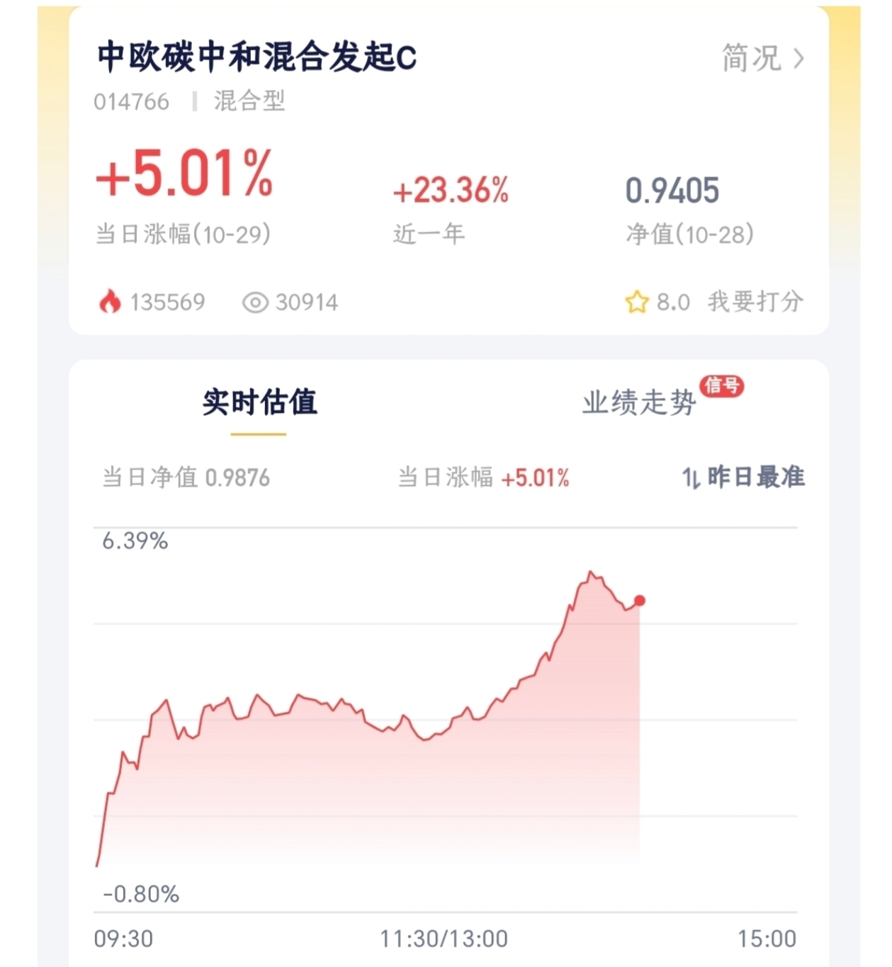 今天市场里光伏板块涨得挺猛,我关注的中欧碳中和混合发起C(OTCFUND|014766)估值涨了5%。看了一下持仓的几只股票,有的都涨了十几个点。最近光伏行业出了反内卷政策,感觉确实有效果,供需关系比之前好多了。从三季度业绩来看,不少企业开始好转,产品价格也在回升。