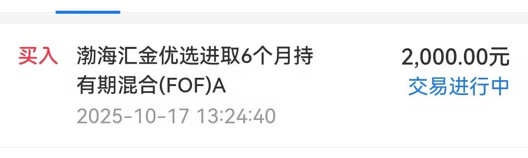 3、$渤海汇金优选进取6个月持有混合发起(FOF)A(OTCFUND|018674)$,买入2000元