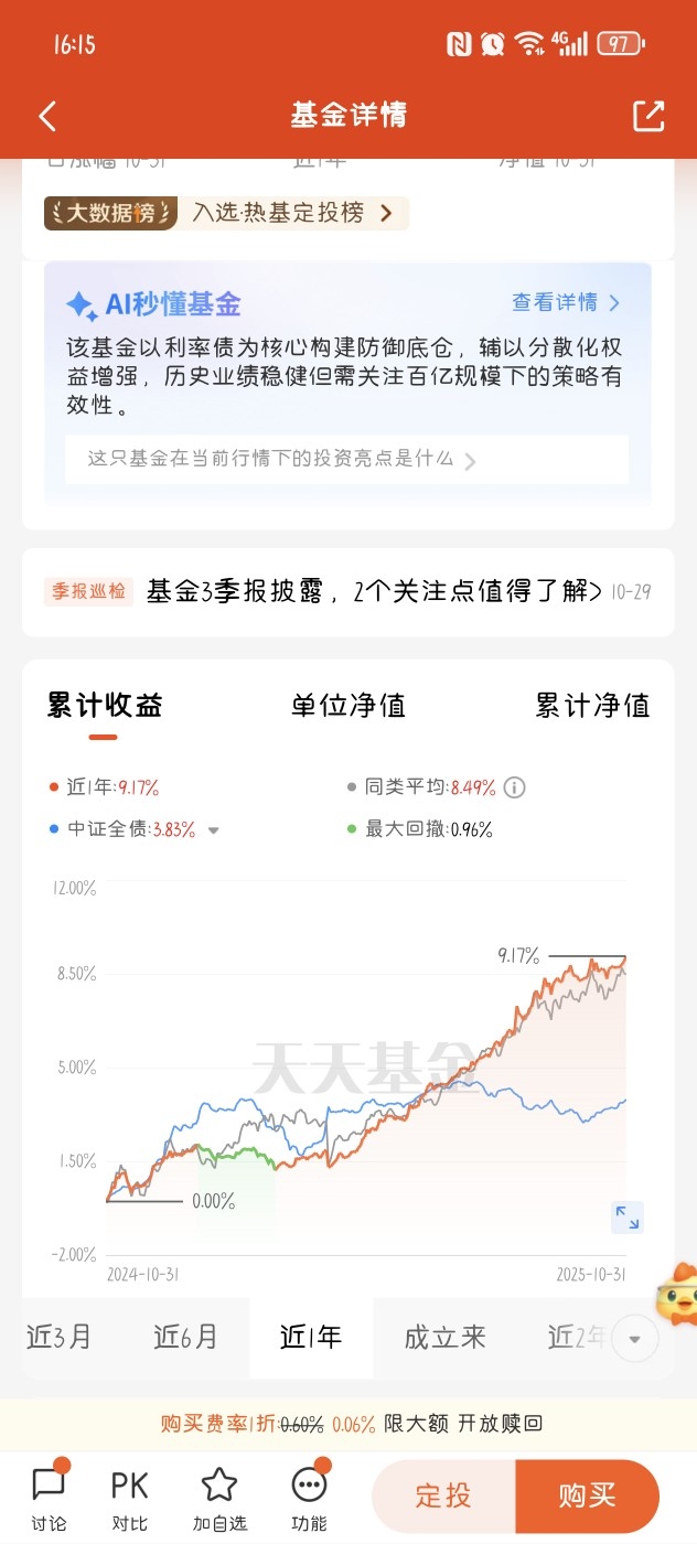 上周$博时恒乐债券A$表现很不错,收蛋四五十个,一年下来累计收蛋900多,且今天限额从1万升到500万,短期大额进出终于不用受限了,再加上上周刚分红,到手的收益立马再投,流动性和收益性全占了。且这只基金还踩准了债市的风口,美联储10月底降息25个基点后,中美利差压力小了很多,外资开始回流国内债市,加上国内央行维持宽松,债市想不涨都难。博时恒乐的债券持仓全是高等级品种,利率债和优质产业债搭配,既稳又有弹性,近三个月稳稳攒蛋300个,产蛋又多又稳。更惊喜的是这基权益仓的神助攻,虽然占比不到20%,但基金经理太会选了,重仓的医疗创新细分龙头最近跟着政策春风涨得不错,还有消费电子板块的个股也在回暖,再加上国泰中证全指证券公司ETF对冲风险,权益部分既能增厚收益又不冒进。近一年最大回撤才0.96%,比很多债基都稳,现在债市行情回暖叠加产品提额,果断追加了仓位!#10月投资总结:我的收益如何了?#