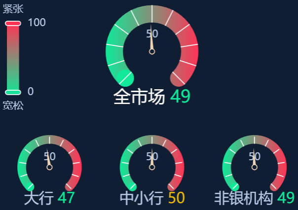 五、资金面情绪指数:全市场49 资金面维稳 (0-100紧张度递增,50为均衡,超过50反映资金紧张)