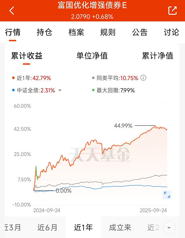 你们没关注的可能都不知道,固收+之间收益差距也很大。有的基金一年就10%左右,我看$富国优化增强债券E$(018980)一年都有42%了。我感觉股基之间的收益差可能是行业的问题,那债基的收益差可能就是不同品种仓位配比的问题,一看果然是,这基金有2成股仓和4成可转债仓,剩下的才是债,等于6成仓可以做增强,现在股市行情来了,感觉真的应该多配点。还有个$富国久利稳健配置混合E$(019370)也挺好的,一年收益70%,最大回撤没超过12%,性价比也很高。#创业板指创阶段新高 致敬“924行情”#