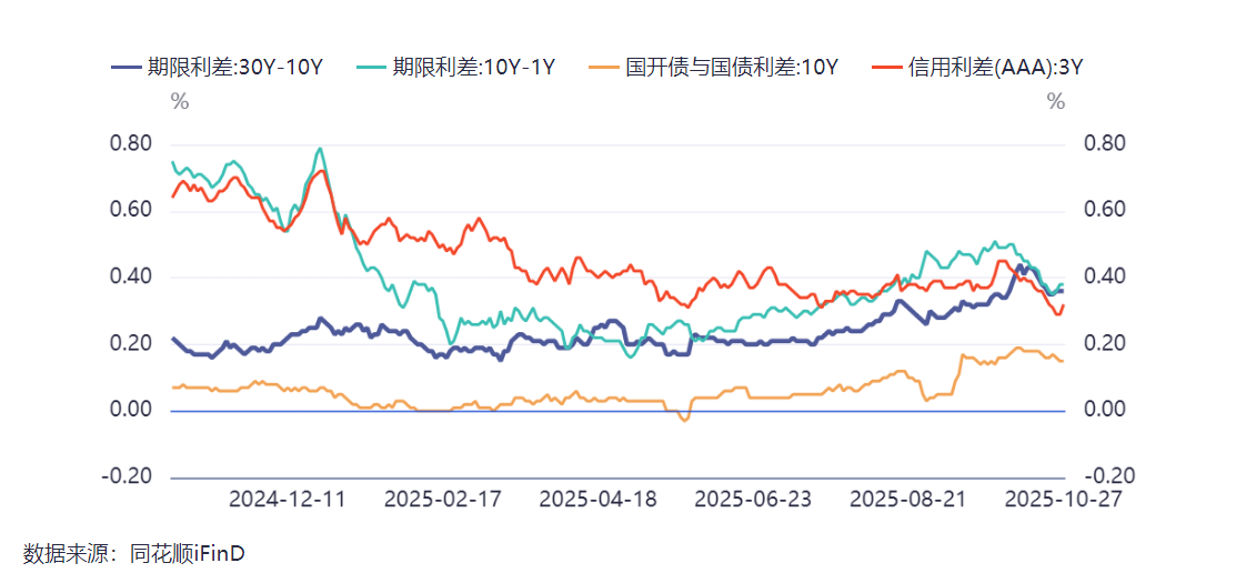 昨天的2025金融街论坛年会上,潘行长宣布“目前债市整体运行良好,将恢复公开市场国债买卖操作”,重启国债买卖得以落地,降准降息预期持续升温,债市情绪得到明显提振。昨天消息出来后,10年期国债收益率直接大幅下行近4BP,今天虽有上行,但叠加昨晚实际还是下行了3BP左右。同时在降息预期推动下,期限利差有望走阔。