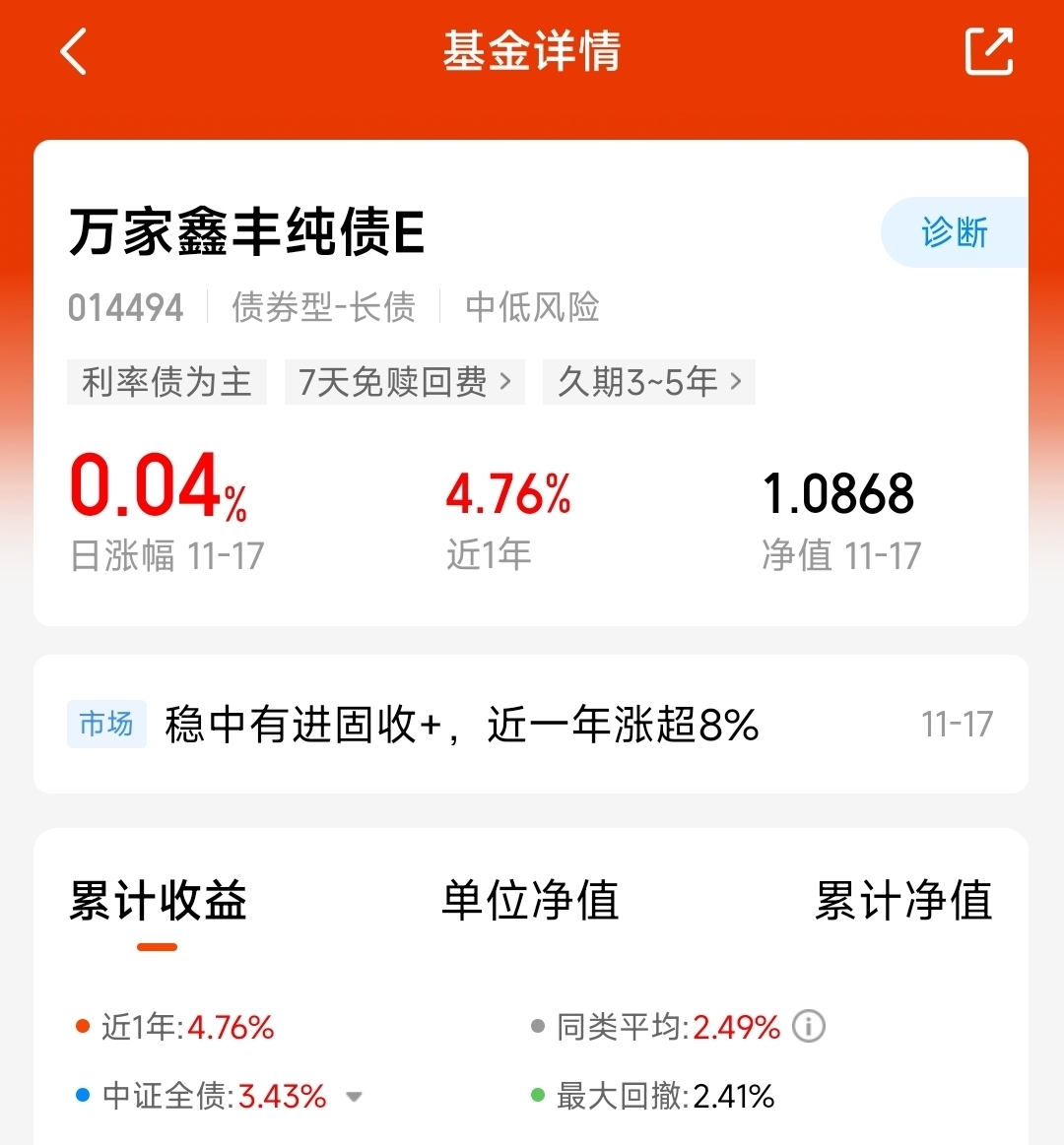 昨天利率债这里还有惊喜啊,万家鑫丰居然能收4个大蛋,这结果也是太给力啦,加个自选