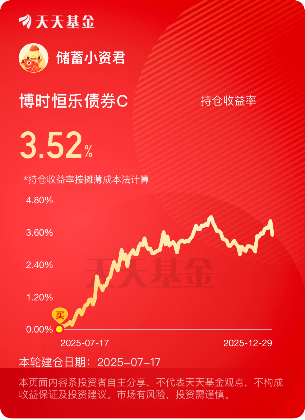 股债股债搭配,配置合理,波动小。权益持仓里有中国宏桥这类资源股,跟着经济复苏走,长期逻辑顺,回调我就加一笔