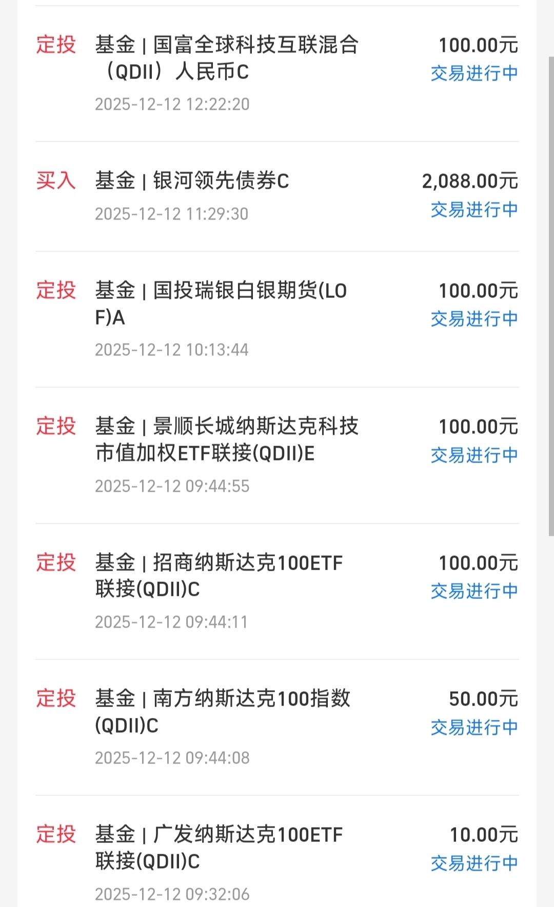 操作3,$国富全球科技互联混合(QDII)人民币C$ ,$景顺长城纳斯达克科技ETF联接(QDII)E人民币$ $招商纳斯达克100ETF发起式联接(QDII)C$ 各定投100元。$南方纳斯达克100指数发起(QDII)C$ 定投50元,$广发纳斯达克100ETF联接人民币(QDII)C$ 定投10元。