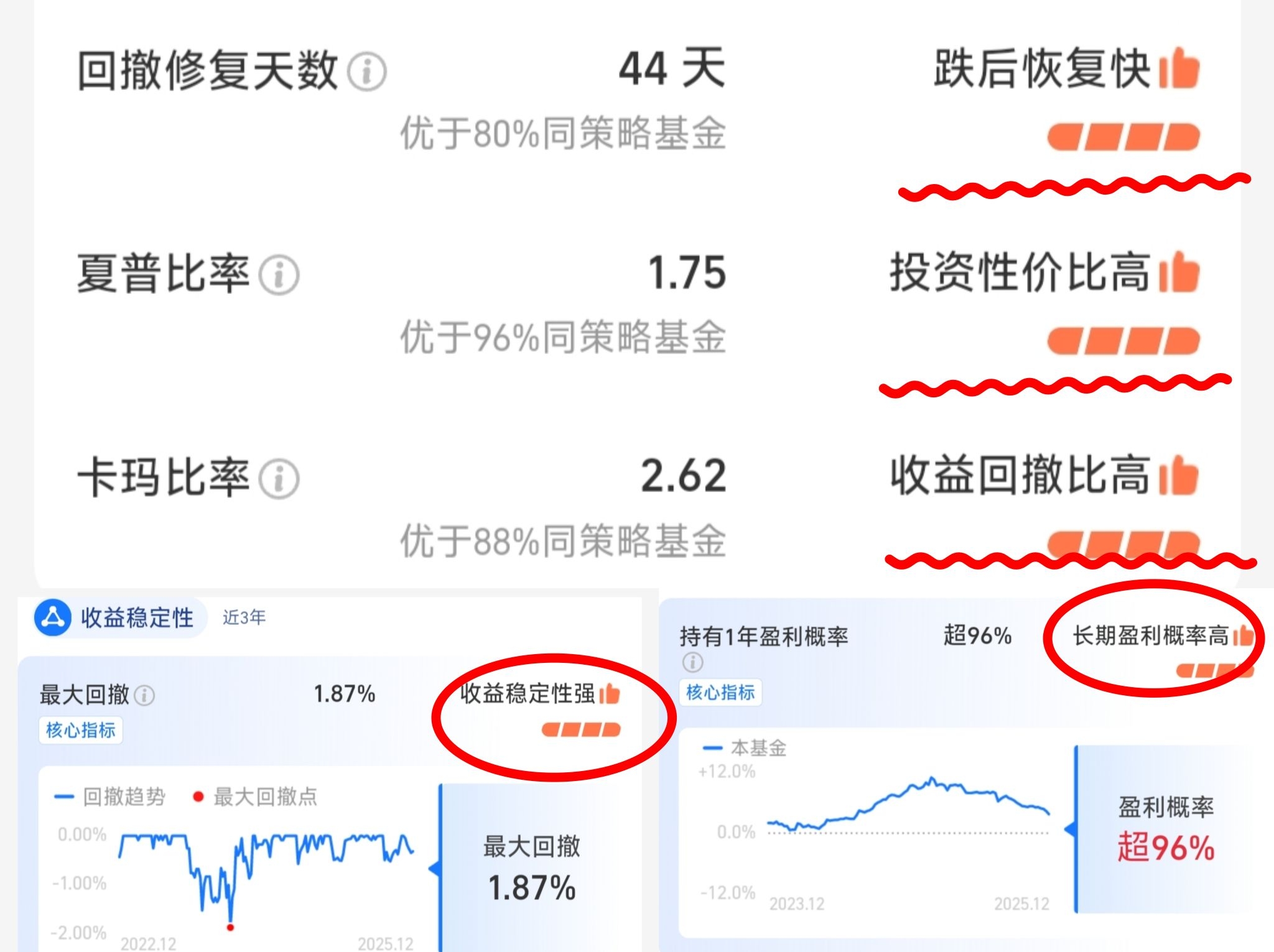 我今天继续布局低风险的固收+,加银河领先债券2千。上车四天就红了三天,感觉赚钱效应不错。最主要回撤小,近一年最大回撤才0.64%,很多波动大的固收+有大几点甚至十几点的回撤。据统计,全市场连续10年最大回撤小于2%的产品,只有10只,而银河领先债券A是这10只中成立以来收益率最高的,真正实现了体验好业绩优。对于像我这种既想跑赢理财收益又不想承受太大波动的人来说,选这只再合适不过了。收益能力、收益稳定性、策略稳定性均获平台认可,这行情能获得平台的三个大拇指,不容易。昨天大部分固收+丢蛋,它却逆势收蛋,五天里红了四天,可谓是能涨抗跌,有稳有稳,有蛋有蛋。