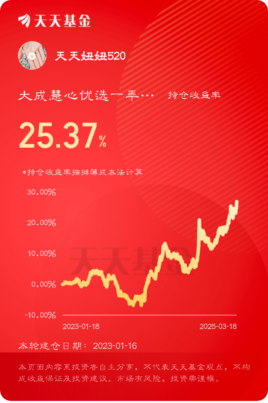 大成真的很棒,从发行买进以来,不但赚的盆满钵满,还把以前亏的基金赚回来了,继续持有