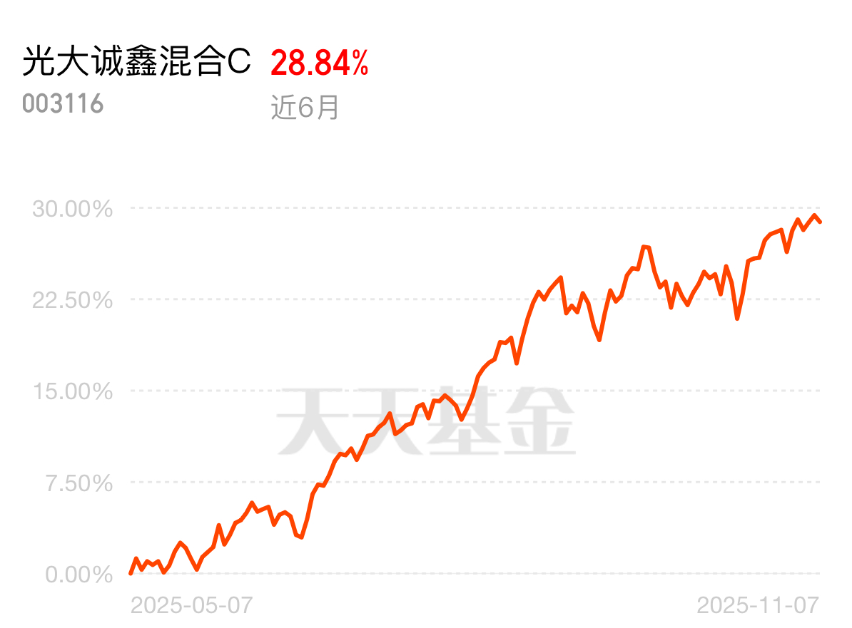 现在混合基金市场分化挺明显,有的波动大还没收益,大家都想找稳当又能赚的。光大诚鑫混合C就很给力,近6个月收益28.84%,不用费心盯盘猜行情,专业团队打理,闲钱投进去放心拿收益。