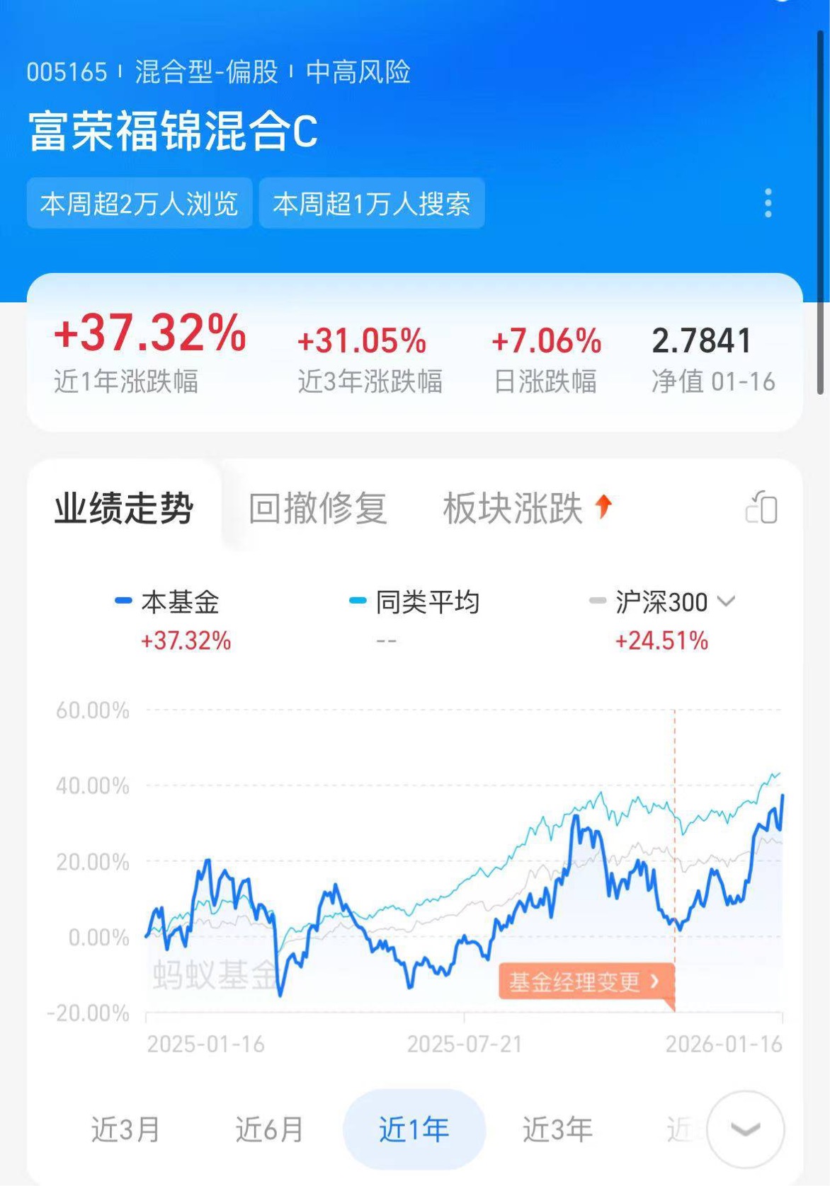 庆幸昨天没被富荣福锦混合C的微调影响,今天就收获7.06%的大涨,近一年37.3