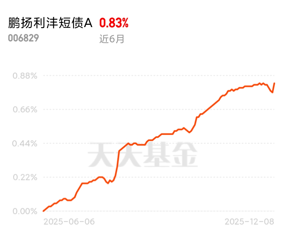 马上年末收官了,股市不太稳,为了保护今年来之不易的收益,我把钱暂时放短债了。意外之喜的是鹏扬利沣A昨天居然收了6个蛋,净值又创了新高。这段时间既避了风险又赚了钱。$鹏扬利沣短债A$