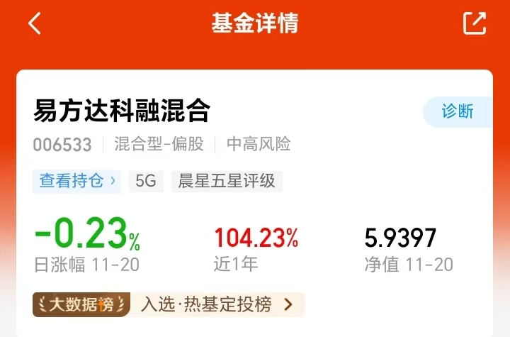 老美降息预期降温引发全球市场震荡,A 股也受波及,今天跌破单3900了,不过我觉得这只是短期的影响,相信国家对大A市场的暖心呵护。但是说归说,单押一个赛道风险还是大的。我觉得波动的市场行情选择均衡配置类的比较好,就像易方达科融混合,可投 A+H 股,布局科技和新能源,近一年涨幅给力还受机构青睐,回撤相对单一赛道的也小得多,还是比较吃香啦~