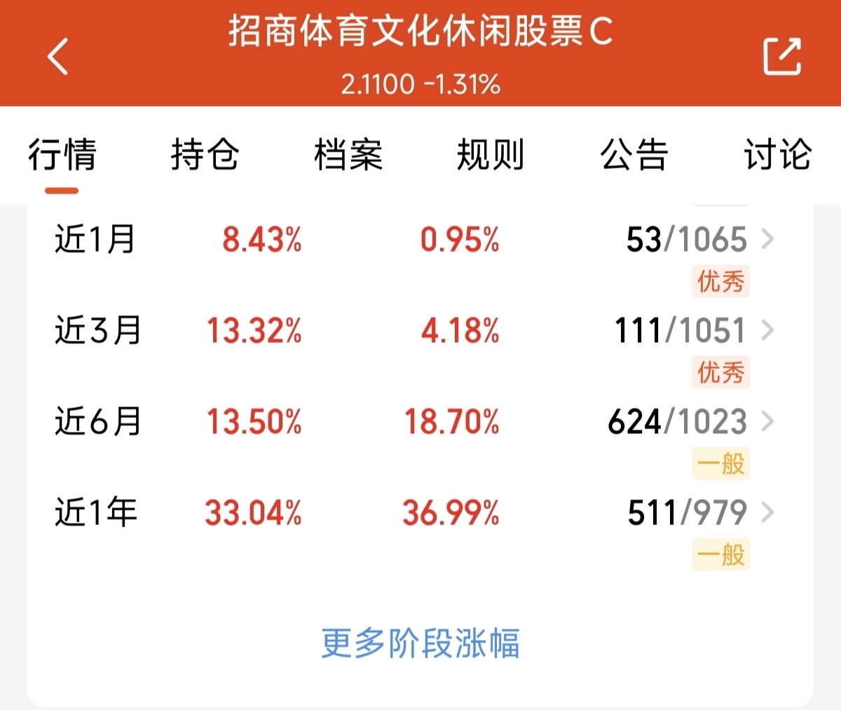 $招商体育文化休闲股票C$ 这只主动的混合基金!目前主要聚焦AI应用产业链,近1月上涨了8.43%!大幅跑赢了同类平均业绩!而且调仓灵活!长期的表现做到了涨多跌少!我看好今年长期的成长表现