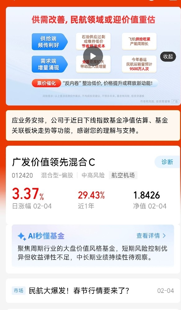 A股节前震荡不知道怎么布局?看民航就够了!广发价值领先混合C近一年涨29.43%