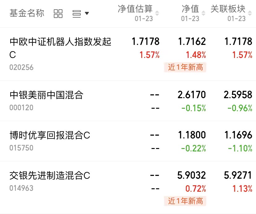 多数热点题材都创下了近两年新高,这类完成突破的热门题材,即便出现短暂调整,后续也有再度拉升的动力。当下机器人板块也正处于上涨走势中,跟随着市场热点的节奏稳步向上。中欧中证机器人上涨1.48%,$中银美丽中国混合(OTCFUND|000120)$下跌0.15%,$博时优享回报混合C(OTCFUND|015750)$下跌0.22%。