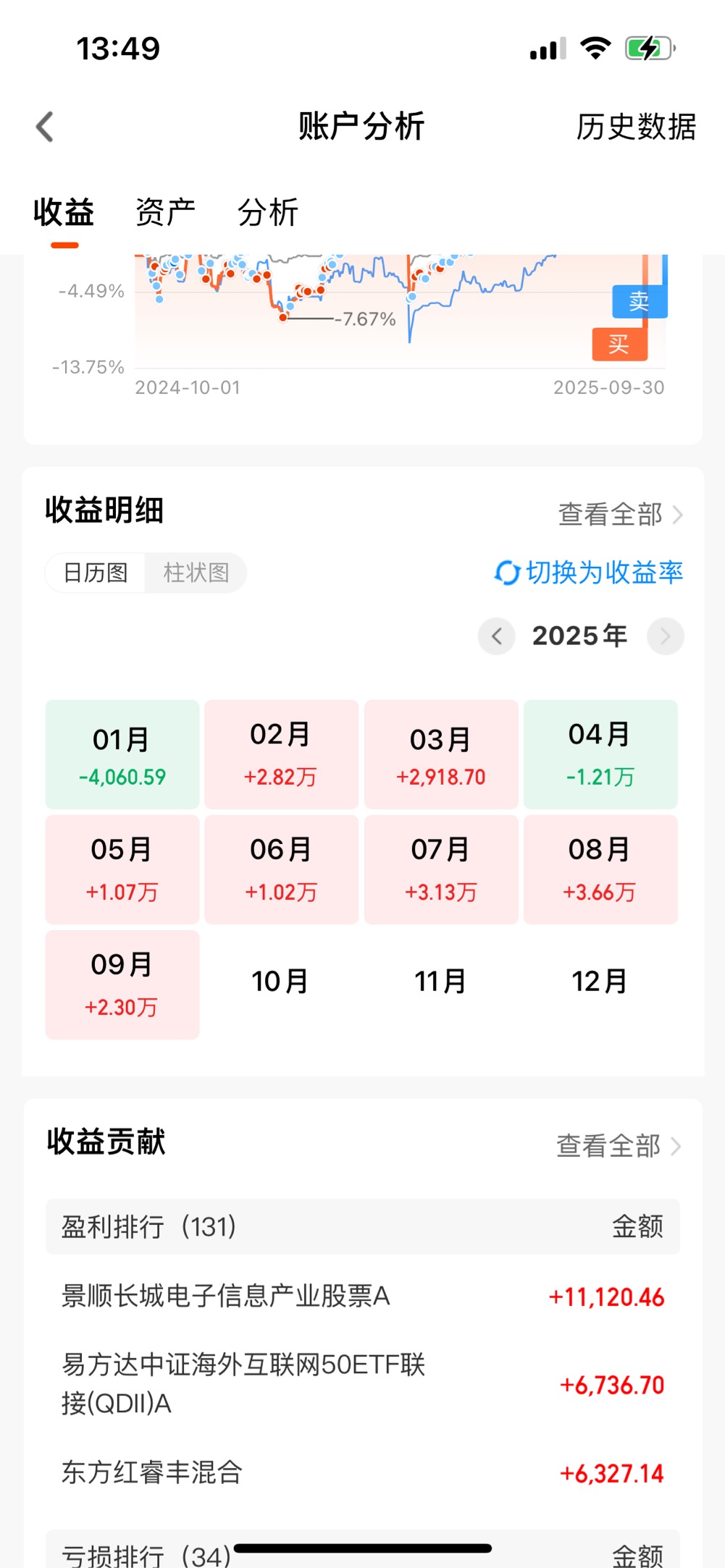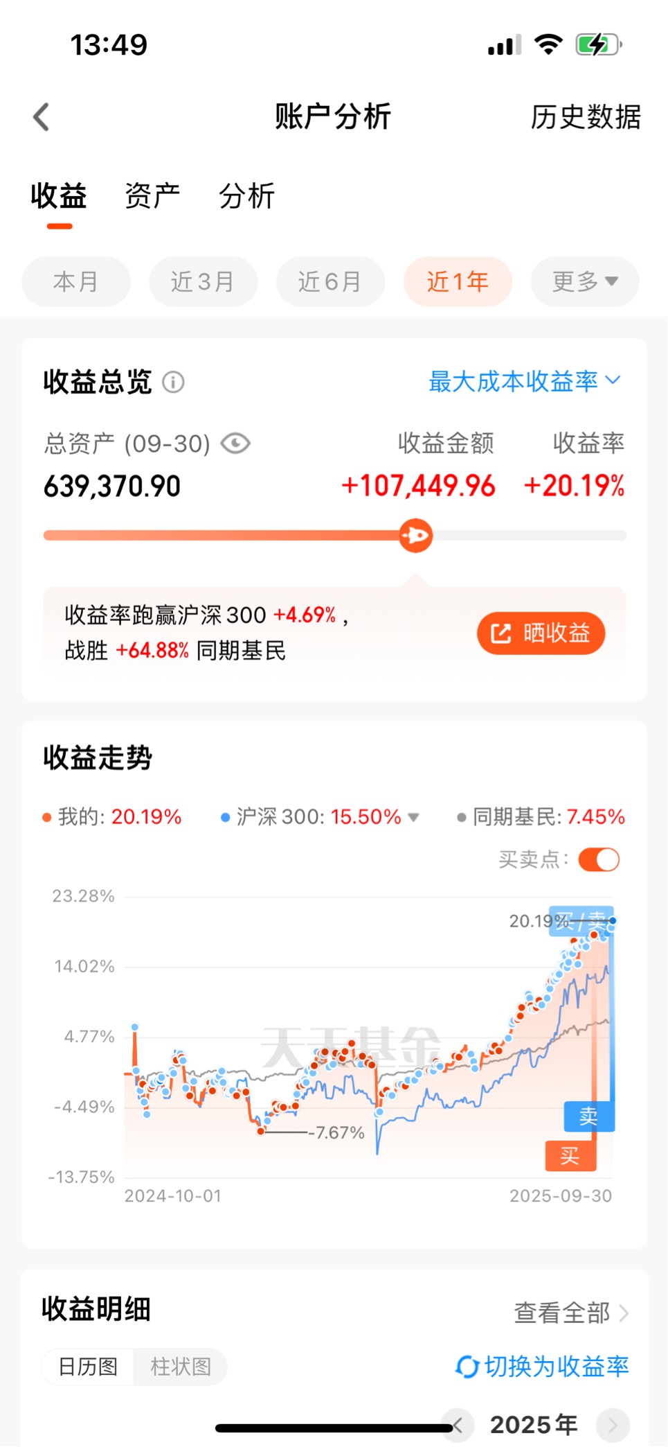 先聊聊这“战果”吧。咱这账户,说多不多,说少也不少。活期宝里躺着16万多,是随时可以调用的“后备兵”;基金占了大头,46万多的规模,昨天一天就赚了4923.06元,这感觉,就像看着自己养的小鸡一天下了个金蛋。投顾虽然只有6千多,但每天也能稳稳贡献50来块的收益,就像个贴心的小跟班。最让我得意的是近一年的收益,107,449.96元的收益金额,20.19%的收益率,超过了沪深300指数4.69个百分点。还记得去年此时,市场还在震荡,我手里的基金也跟着起起落落,最低的时候还亏到过-7.67%,那时候心里真跟揣了只兔子似的,七上八下。但我咬咬牙,想着投资哪有一帆风顺的,就像种地,总得经历风雨才能收获。没想到坚持下来,从今年5月开始,收益就像开了挂,5月赚1.07万,6月1.02万,7月3.13万,8月更是冲到3.66万,9月也有2.30万。看着这些数字逐月攀升,那种成就感,比过年收到大红包还开心!