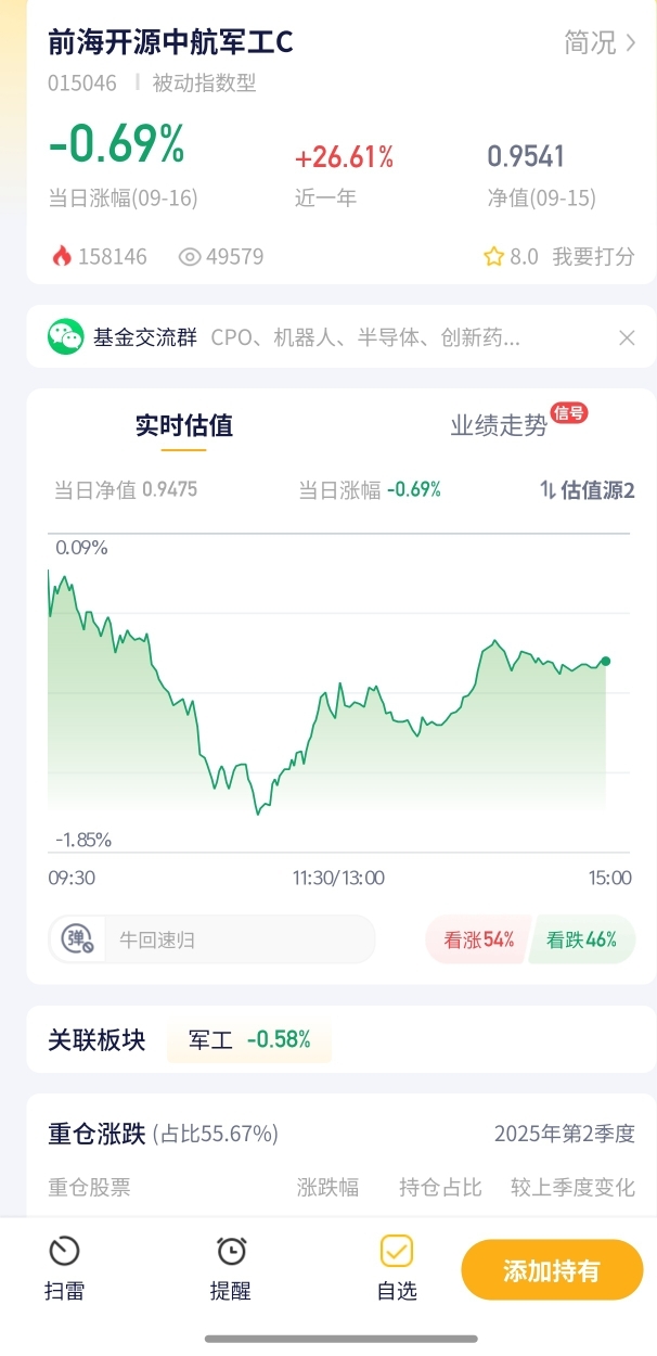 7. 前海开源中航军工C:昨天跌0.56%,今天估算跌0.69%,今天跌得比昨天多,有点小失望,继续观望。