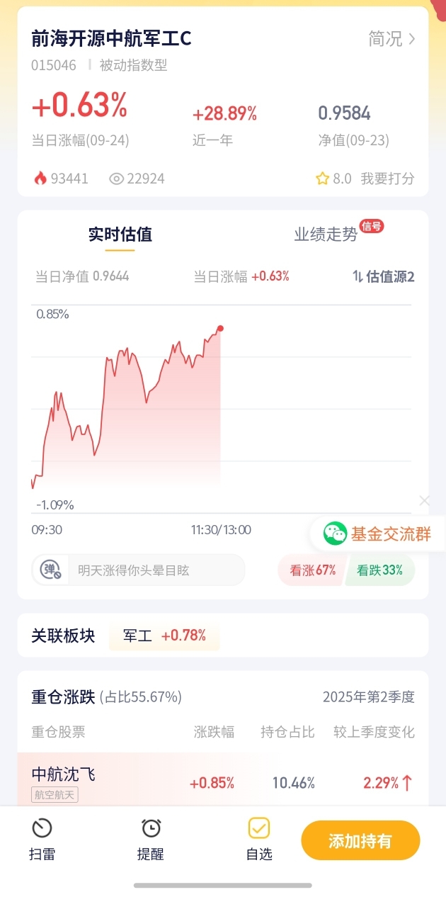 6. 前海开源中航军工C:昨天跌0.58%,今天涨0.63%,中航军工的表现,就像稳步爬坡,虽慢但稳,给人惊喜。