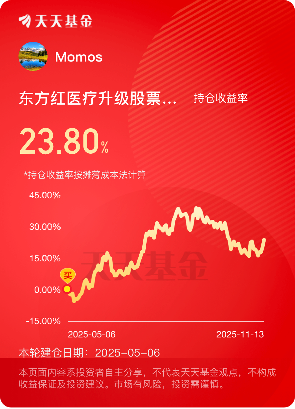 连涨2天,昨天也收快3个点,只要市场涨势还在,就还有机会,医药行情支撑强,韧性足,涨起来也是猛的,继续拿住$东方红医疗升级股票发起A$ #晒收益#