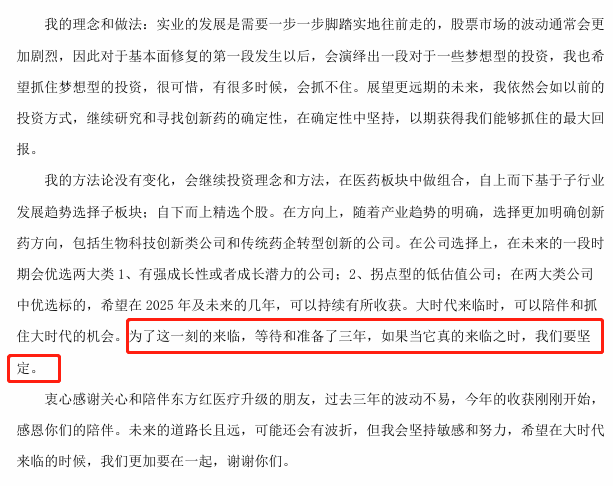 “随着市场的调整,梦想回归理性,我们坚持理性分析,当市场因为非理性的外部因素带来剧烈波动时,我和你们大家一样难受,但是难受的同时,我们要做的是擦干眼泪,理性分析,谨慎决策,又积极变化。坚持对于创新药的积极研究,同时又要继续引入纠偏机制,同样要保持敏感度积极寻找一些底部的新机会。”