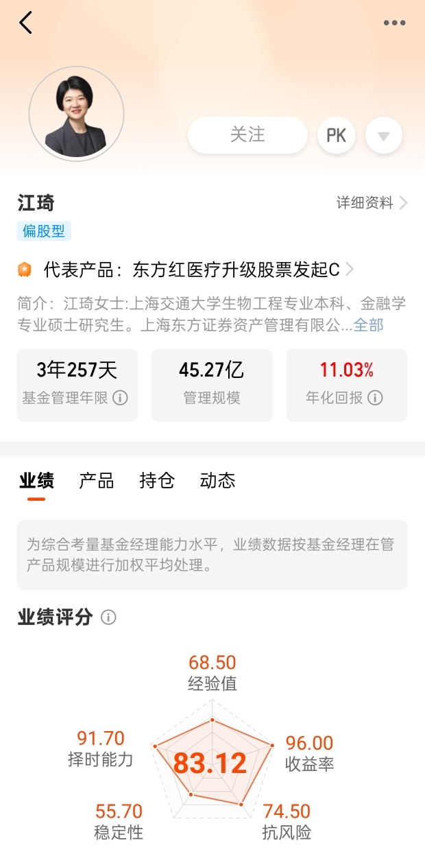 江琦的投资理念是“在医药板块中做组合”,通过自上而下选子版块、自下而上选个股的方式构建投资组合,聚焦创新药赛道,优选成长型与低估值拐点型公司。这一逻辑既贴合行业创新趋势,又能平衡估值与成长风险。从业绩来看,截至2025年10月,其管理的东方红医疗升级基金近三年在银河证券同类基金中排名前三,获三年期五星评级,2022-2023年弱市抗跌,2024年下半年重仓创新药又精准捕捉行情,展现出优秀的市场把握能力。