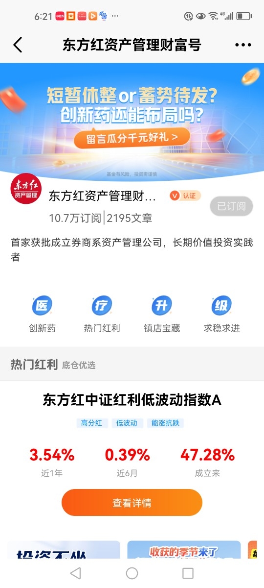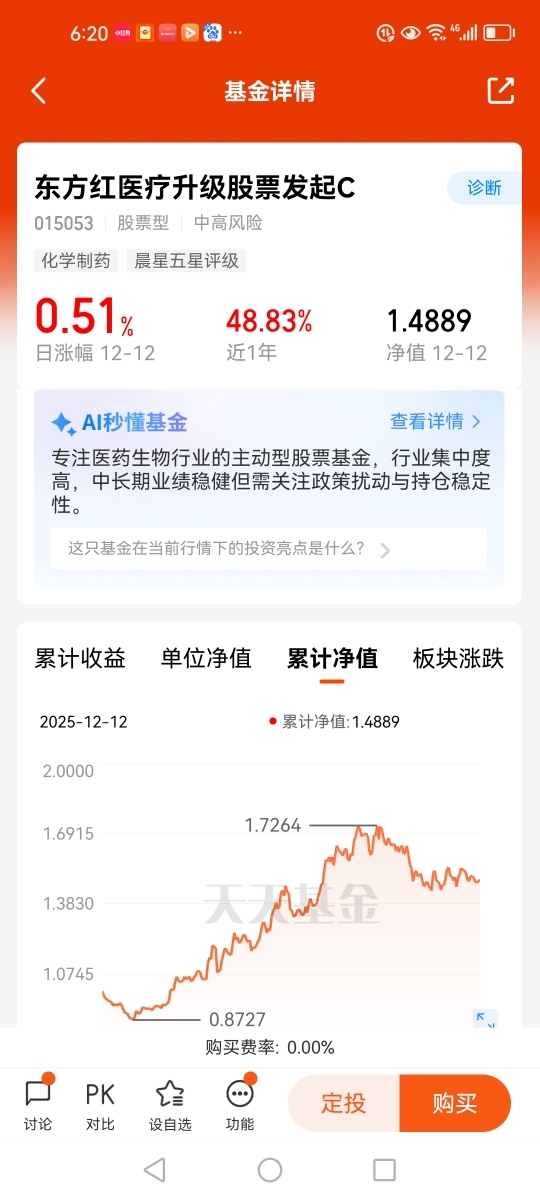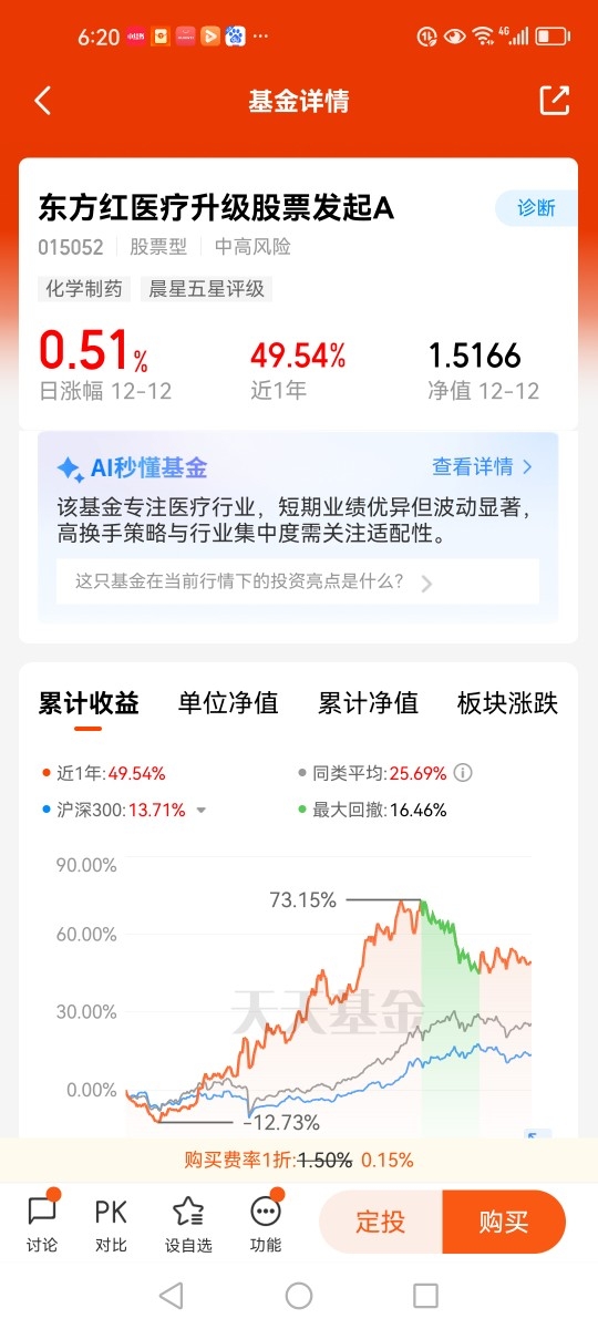 $东方红医疗升级股票发起A$主要投资于医疗升级相关的上市企业,聚焦医药生物行业,重仓港股创新药(科伦博泰生物-B、三生制药)。基金经理江琦毕业于上海交通大学生物工程专业本科、金融学专业硕士研究生。拥有12年医药行业研究经验,曾任多家机构医药首席分析师,投研能力圈聚焦医疗领域。在医药板块中做组合,自上而下选择子版块,自下而上精选个股,优选有强成长性或者成长潜力的公司和拐点型的低估值公司。截止目前,该基金A份额今年以61.05%的涨幅,在同类排行前10%(88/969),业绩表现优秀。本人看好$东方红医疗升级股票发起$这只聚焦医疗行业的主题基金,并重点关注。@东方红资产管理