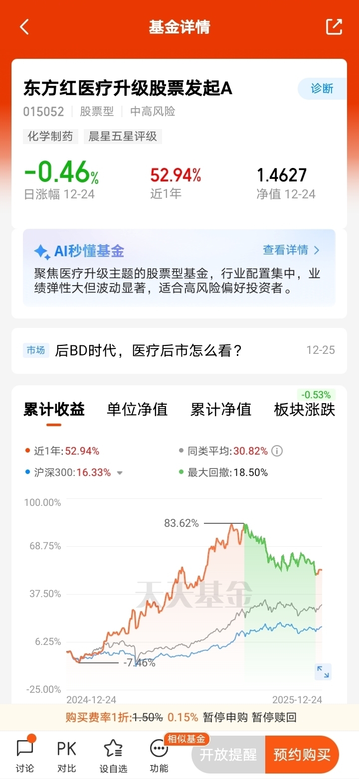 经过近两个月调整,医药板块有回暖势头,截至12月24日,该基金近一周净值开始修复。