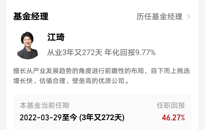江经理的代表作是$东方红医疗升级股票发起A$ ,该基金主要投资医药股,聚焦成长性强、成长潜力较大的公司和拐点型的低估值公司,近三年涨幅高达78.28%,大幅跑赢同期业绩比较基准收益率8.79%,在同类产品中排名第3(银河证券截至11月25日),晨星评级为五星,意味着该基金的业绩较优,投资风格不飘移 。