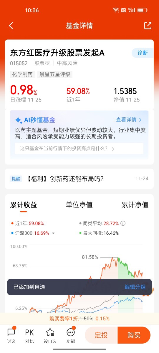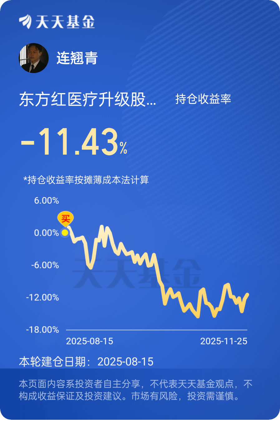 今年8月买入$东方红医疗升级股票发起C$ ,最初确实带有一定“跟风属性”。彼时中证沪港深创新药产业指数自2022年低点以来累计涨幅已超90%,$东方红医疗升级股票发起A$ 近三年78.28%的同类TOP3业绩更是亮眼——作为风险承受能力中等的投资者,我既想分享创新药赛道成长红利,又担心短期波动风险,而C类份额免申购费、持有7天免赎回费的设计,恰好契合我“先小仓位试错、长期看好则持有”的投资计划。