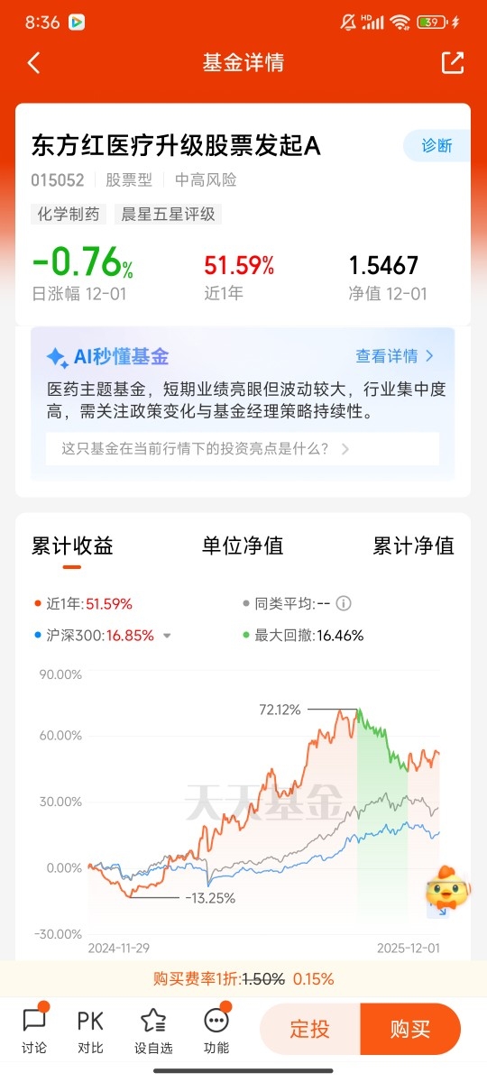 在具体标的选择上,我没有选择直接投资个股,而是将目光锁定在东方红医疗升级股票发起式(A/C)这只基金上。之所以选择这只基金,是基于对其投资价值和持有体验的综合考量,也是我多年投资经验的积累。