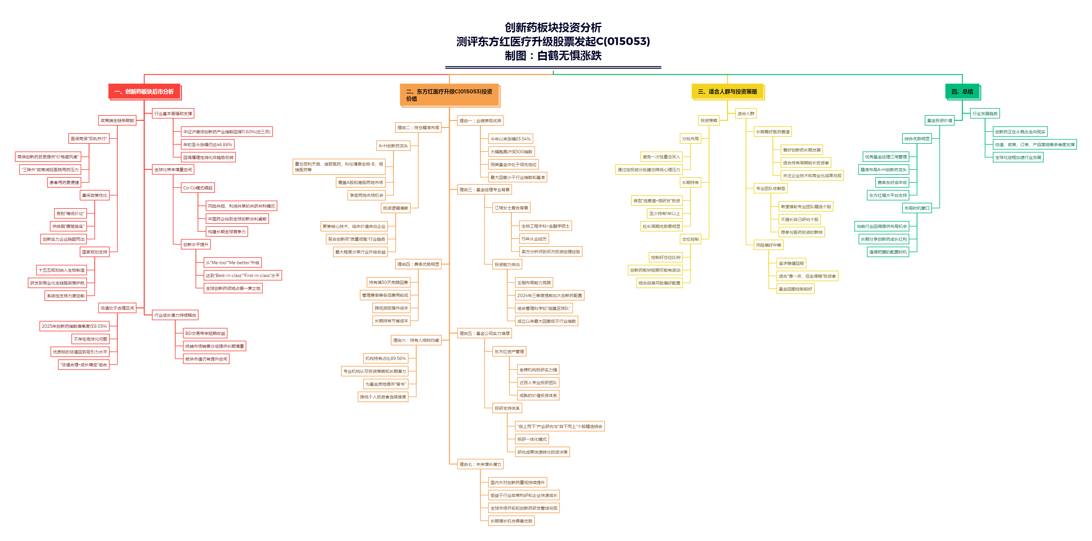 接下来就和大家一起聊聊自己对于创新药板块的看法,并深度测评下东方红医疗升级股票发起C(015053),文章有点长,这里也是做了个思维导图,方便大家整理思路,可以点开放大了看下的。