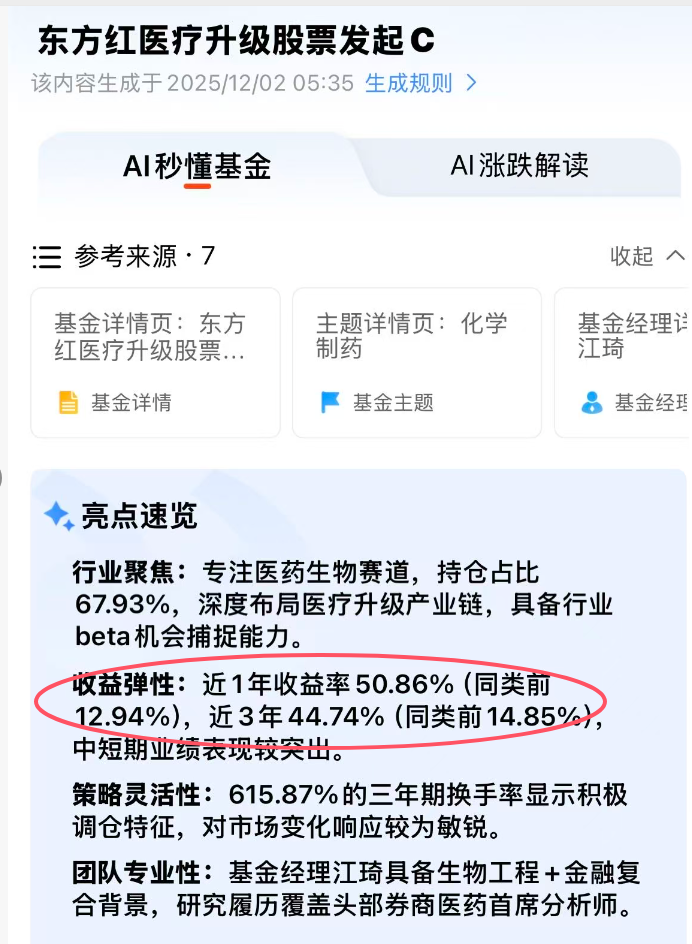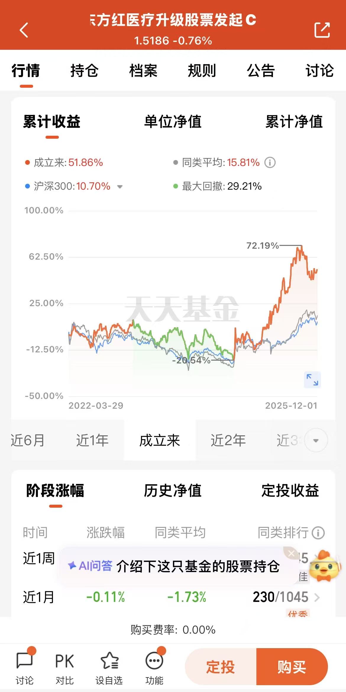 如东方红医疗升级基金,成立于2022年3月29日,C类成立以来收益率达51.86%,同类平均为15.81%,同期沪深300为10.7%,这就是阿尔法收益,远远超越同类平均和沪深300;