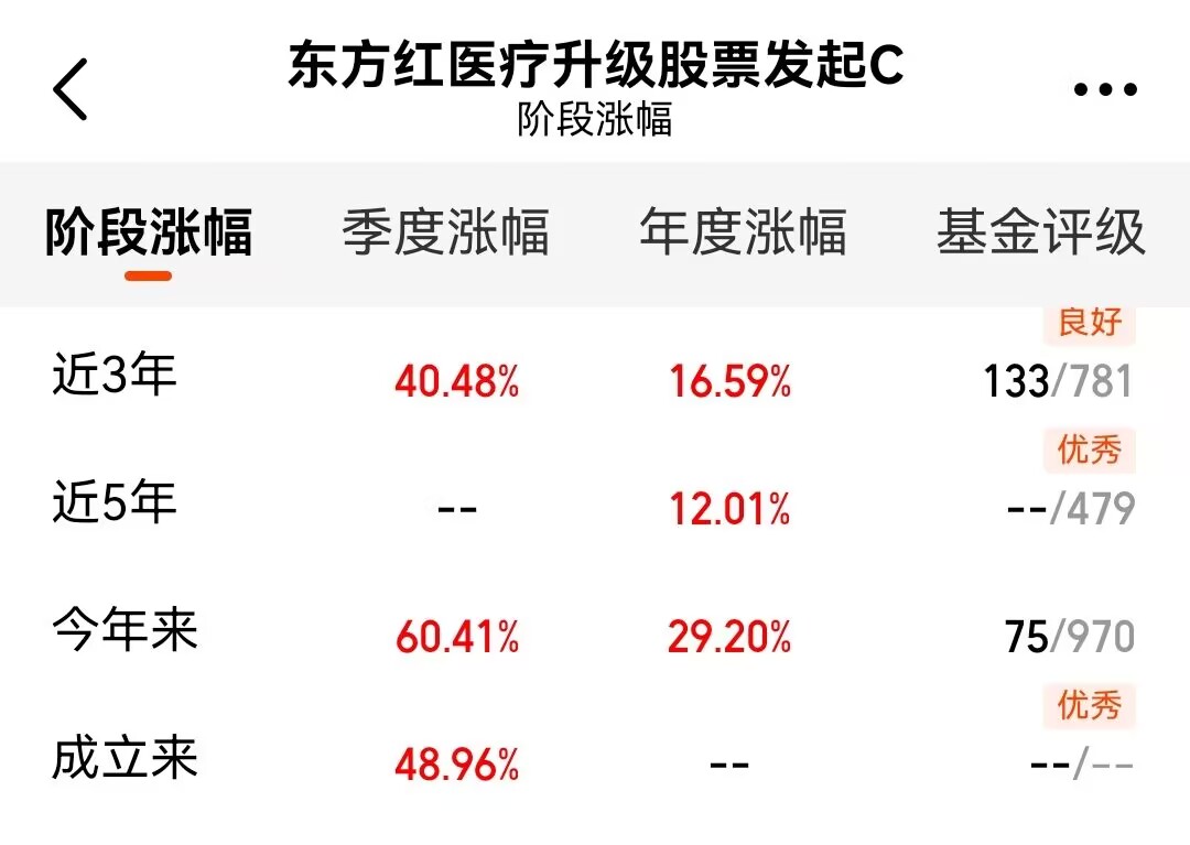 $东方红医疗升级股票发起C(OTCFUND|015053)$虽然这段时间随市场出现了一定回撤,但今年来仍有超60%的涨幅,业绩表现远超医疗指数,超额收益明显,后续的表现也是非常值得期待的。我先加自选收藏,后面考虑择时上车。