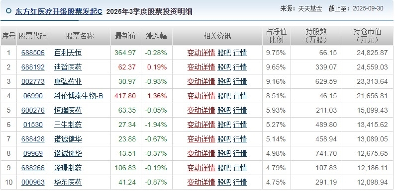 看看它的持仓,你就会明白它的纯粹。截至2025年三季度末,其前十大重仓股几乎全部集中于创新药领域,如百利天恒、迪哲医药、科伦博泰生物-B、恒瑞医药等。前十大持仓占比高,显示出集中持股、深度研究的风格。它不追求分散的平庸,而是追求聚焦的卓越。