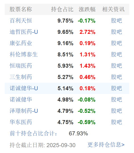 当前持仓持仓集中,前十大重仓股占比67.93%,"少而精"策略,重仓高成长创新药标的,布局A股创新药+科创板+港股创新药,分散风险并捕捉全球机会。重点关注的是已上市并快速放量的创新药、具备全球竞争力的研发管线、低估值转型创新的传统药企。