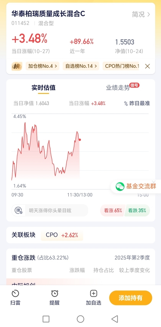 各位投资小伙伴,CPO今天表现亮眼!华泰柏瑞涨了3.48%。摩根士丹利预测行业将迎来AI驱动的“超级周期”,2025年全球存储收入有望达2000亿美元,这给CPO和存储产业带来满满期待。这基金专注质量成长,重仓CPO等优质板块,要是你觉得CPO和AI存储这块有前景,想布局一下,它可以了解了解。不过投资有风险,得根据自己的风险承受能力来,可别跟风瞎投。$华泰柏瑞质量成长C$ #高盛看多A股:慢牛正形成 还有约30%上涨空间#