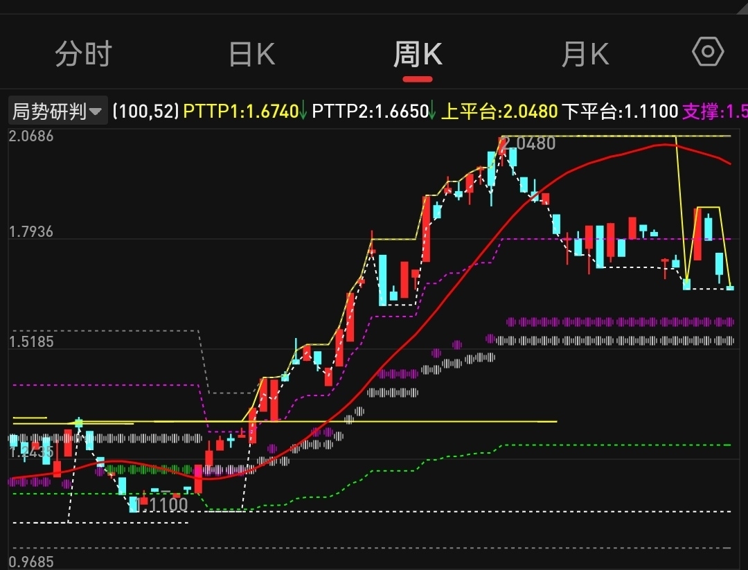 年底年初,为期三个月的跨年行情,画出了一个大中枢,上沿仍受制于100天的中位线,下边还是要关注红点(1.58元)的支撑。